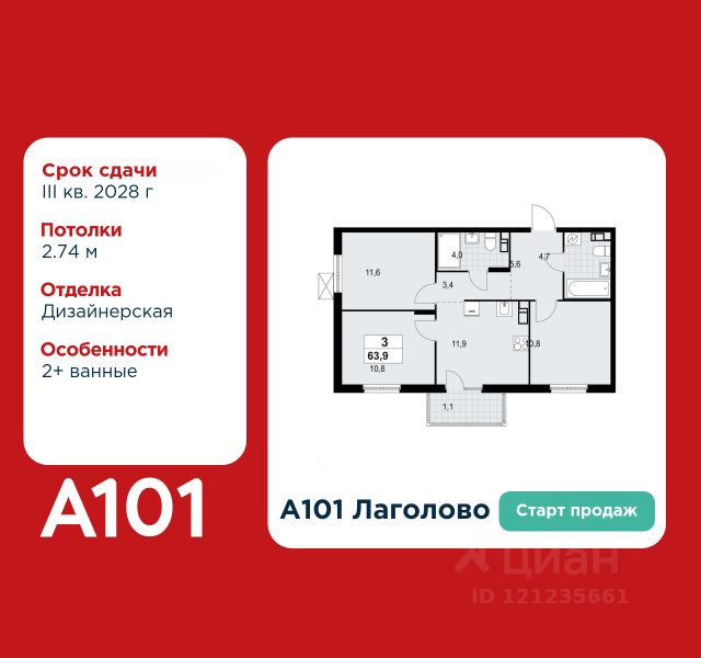 Старт продаж! 3-комнатная квартира площадью 74.55 в ЖК "А101 Лаголово" на 2 этаже. Квартира без отделки. Вид из окна на улицу. В квартире 2 санузла. Высота потолков 2.74 м. Предложения от застройщика на декабрь 2025: - Гибкая рассрочка 20 000 руб/мес. и первым взносом 10%. ОТДЕЛКА Квартира передается без отделки. Благодаря тому, что в данном типе отделки стены не возводятся, вы сможете создать удобную планировку и самостоятельно организовать зонирование комнат. КВАРТИРА С МЕБЕЛЬЮ И ТЕХНИКОЙ В стоимость квартиры включен сертификат на 100 000 рублей от партнеров Hoff и M.Видео. Вы можете увеличить сумму сертификата и добавить его в ипотеку. А также у вас будет возможность увидеть все товары вживую перед установкой и выбрать лучшие варианты для обустройства вашей квартиры. ПАРАДНАЯ. В каждой парадной предусмотрены места для хранения велосипедов и колясок, гостевой санузел и удобная зона ожидания для гостей. ДВОРЫ И ОКРУЖЕНИЕ. Просторные дворы безопасны для детей, так как свободны от машин, закрыты от посторонних и постоянно находятся под видеонаблюдением. Во дворах создается разнообразная среда для детей всех возрастов: детские площадки с батутами, тактильными дорожками и игровыми комплексами. Для активного отдыха - воркаут-площадки, столы для пинг-понга и газоны для занятий йогой. Во дворах есть и тихие уголки - зеленые гостиные с уличной мебелью, где можно поработать на свежем воздухе или отдохнуть в тишине. Из внутренних дворов комплекса можно выйти на пешеходный бульвар длиной около 900 метров. Здесь будет организовано полноценное общественное пространство с амфитеатром, уличным кафе, ручьем, фонтаном и множеством мест для отдыха и игр. Большую часть бульвара займут благоустроенные зеленые зоны и теневые сады из десятков видов деревьев и кустарников, многолетних цветов и трав, которые будут радовать глаз круглый год. "А101 Лаголово" - современный город у подножия знаменитых Дудерговских высот, в объятиях чистейших озер и зеленых живописных массивов, наполненный всем необходимым для счастливой жизни. ИНФРАСТРУКТУРА. Мы занимаемся комплексным освоением территории. Наш приоритет - доступность всех сервисов для счастливой жизни. 1. Лаголово-город 15-ти минутной доступности. Вся необходимая инфраструктура: магазины, салоны красоты, образовательные учреждения, медицинские центры находятся в 15-ти минутах пешей прогулки от любой точки жилого комплекса. Это позволяет не тратить время на долгие перемещения. 2. Представьте идеальный город, где ребенок может спокойно играть, а пожилой человек наслаждаться заслуженным отдыхом. Жилая среда нашего комплекса может комфортно использоваться как 8-летним ребенком, так и 80-летним пожилым человеком. Дома, улицы, общественные пространства, тротуары спроектированы с заботой о людях разных возрастов. 3. Мы активно развиваем авторскую образовательную экосистему "Лёрнити". Она включает строительство 8 современных детских садов (2000 мест) и 3 школ (2945 учащихся). Мы учим родителей гармонично общаться с де