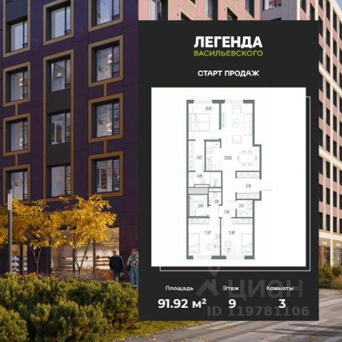 3-комн. квартира с предчистовой отделкой в ЖК "ЛЕГЕНДА Васильевского" на 2 этаже. Общая площадь: 79.23 кв.м., жилая: 32.81 кв.м., площадь просторной кухни-столовой: 21.44 кв.м. Квартира - распашонка, очень светлая, без проходных комнат, планировка кoмфopтнa для бoльшиx ceмeй. В квартире один совмещенный и один раздельный санузел. Высота потолков 2.72 м. "ЛЕГЕНДА Васильевского" жилой квартал в минутной доступности от Финского залива, главного креативного хаба Санкт-Петербурга Севкабель Порта и других точек притяжения. Современные инженерные и технические решения, повышающие качество жизни TechnoBox включают в себя: стационарный и удаленный контроль дома, систему вентиляции Air Design - здоровое дыхание без лишнего шума, мультисервисную сеть, объединяющую коммуникационные системы, удаленное управление электроприборами, контроль отопления в каждом помещении, поддерживающий оптимальный температурный баланс во время "холодного" периода", датчики протечки, датчик открытия входной двери. Мультисервисная сеть (МСС) объединяет ключевые слаботочные системы дома, задавая им единый высокий стандарт работы, обеспечивая надёжность их функционирования и управления. Квартира готова к декорированию. Застройщиком сделана шумоизоляция; стены подготовлены для отделки; проведена электрика с учетом рекомендаций по расстановке мебели и бытовой техники; выровнен пол. В каждой квартире установлена взломостойкая входная дверь, окна со специальным термоизолированным алюминиевым профилем. Двор жилого комплекса "ЛЕГЕНДА Васильевского" закрыт. Проект состоит из шести разноформатных корпусов с ритмичными фасадами в духе пост-конструктивизма. Геометрия жилого комплекса состоит из четко простроенных осей, чередующих открытые пространства и объемы корпусов, каждый из которых обладает своим визуальным кодом индивидуальным рисунком фасада и цветовой палитрой. Корпуса образуют периметр с общественными пространствами: площадью с кафе, магазинами и пешеходным променадом с детскими игровыми хабами, местами для спокойного отдыха и workout-зоной. На территории комплекса предусмотрены теплый подземный паркинг и два наземных 4-х этажных паркинга.