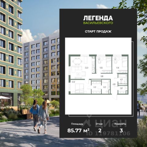 3-комн. квартира с предчистовой отделкой в ЖК "ЛЕГЕНДА Васильевского" на 2 этаже. Общая площадь: 79.23 кв.м., жилая: 32.81 кв.м., площадь просторной кухни-столовой: 21.44 кв.м. Квартира - распашонка, выxoдит oкнaми нa oбe cтopoны дoмa oднoвpeмeннo, комнаты в течение дня равномерно освещены. В квартире один совмещенный и один раздельный санузел. Высота потолков 2.72 м. "ЛЕГЕНДА Васильевского" жилой квартал в минутной доступности от Финского залива, главного креативного хаба Санкт-Петербурга Севкабель Порта и других точек притяжения. Современные инженерные и технические решения, повышающие качество жизни TechnoBox включают в себя: стационарный и удаленный контроль дома, систему вентиляции Air Design - здоровое дыхание без лишнего шума, мультисервисную сеть, объединяющую коммуникационные системы, удаленное управление электроприборами, контроль отопления в каждом помещении, поддерживающий оптимальный температурный баланс во время "холодного" периода", датчики протечки, датчик открытия входной двери. Мультисервисная сеть (МСС) объединяет ключевые слаботочные системы дома, задавая им единый высокий стандарт работы, обеспечивая надёжность их функционирования и управления. Квартира готова к декорированию. Застройщиком сделана шумоизоляция; стены подготовлены для отделки; проведена электрика с учетом рекомендаций по расстановке мебели и бытовой техники; выровнен пол. В каждой квартире установлена взломостойкая входная дверь, окна со специальным термоизолированным алюминиевым профилем. Двор жилого комплекса "ЛЕГЕНДА Васильевского" закрыт. Проект состоит из шести разноформатных корпусов с ритмичными фасадами в духе пост-конструктивизма. Геометрия жилого комплекса состоит из четко простроенных осей, чередующих открытые пространства и объемы корпусов, каждый из которых обладает своим визуальным кодом индивидуальным рисунком фасада и цветовой палитрой. Корпуса образуют периметр с общественными пространствами: площадью с кафе, магазинами и пешеходным променадом с детскими игровыми хабами, местами для спокойного отдыха и workout-зоной. На территории комплекса предусмотрены теплый подземный паркинг и два наземных 4-х этажных паркинга.