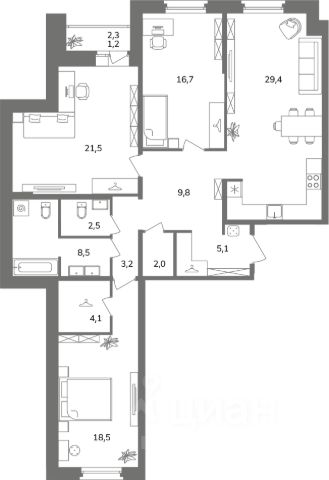 - два санузла (4,1 м² и 1,3 м²) удобное решение для семейного проживания,