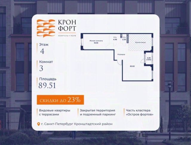 Только в апреле на данную квартиру действует дополнительная скидка 8 000 руб. с кв.м. Стоимость квартиры в объявлении указана со скидкой 21%. Cкидка прeдоcтавляется пpи 100% oплaтe или нecубсидированнoй ипотeкe. Возможно повышение скидки до 24%. Подробности уточняйте в отделе продаж. Предлaгaeтся квартира плoщaдью 74.37 кв.м в жилом кoмплексе "Kронфoрт. Центpальный" в Санкт-Петeрбурге (Кронштадт). Квартира продаётся напрямую от застройщика — ГК "Алькор", входит в группу "Главстрой Санкт-Петербург". Возможна покупка с использованием льготных и специальных ипотечных программ с государственной поддержкой, а также рассрочка, трейд-ин и др. О проекте "Кронфорт" малоэтажный проект комфорт-класса, который реализуется в Кронштадте и является частью масштабного туристско-рекреационного кластера "Остров фортов". Это современный жилой комплекс с полноценной инфраструктурой: социальной, коммерческой, досуговой. Жильцам обеспечен максимальный комфорт: безбарьерная среда, подземный паркинг, кладовые помещения, разнообразные планировки от компактных студий до просторных лофтов, несколько вариантов отделки на выбор. Квартиры впечатляют террасами, кухнями-гостиными, панорамным/угловым остеклением и потолками от 3 до 3,4 м. Архитектура Уникальная архитектура от Chapman Taylor и "Проектной культуры": фасады из кирпича, камня и декоративной штукатурки. Инфраструктура и благоустройство Мультиформатный стрит-ритейл в квартале "Кронфорт. Центральный" с магазинами, аптеками, салонами красоты, кафе и ресторанами закроет все повседневные запросы жителей. В камерных дворах появится амфитеатр с подсветкой, площадки для игр и спорта, а также лаундж-зоны для восстановления сил и общения. Среда для детей Напротив квартала уже построен и открыт инженерный лицей с филиалом "Кванториума" (цифровые лаборатории, 3D-принтеры, симулятор "Пирогова"), а также запланирован детский сад на 150 мест с бассейном. Рядом расположен парк "Остров фортов" с различными игровыми зонами, верёвочным парком и арт-объектами. Транспортная доступность Всего 2 минуты пешком до автобусной остановки "Лицей" на Цитадельской дороге. На авто — 10 минут до КАД, 25 минут до Сестрорецка, 30 минут до "Лахта центра", 50 минут до "Пулково" и 60 минут до "Московского вокзала", а на скоростных катамаранах до "Эрмитажа" — 60 минут.