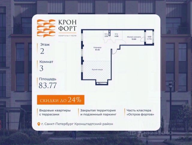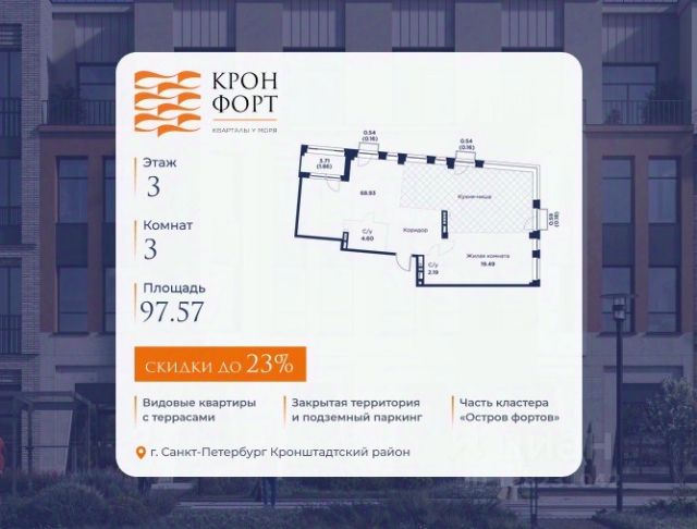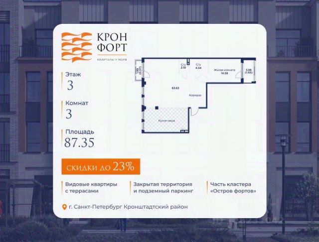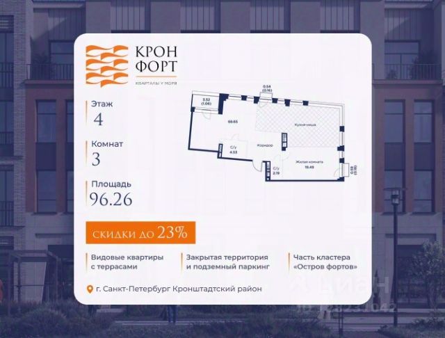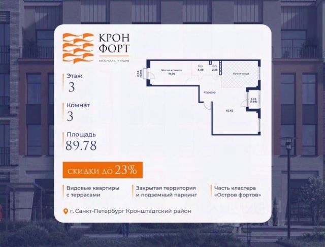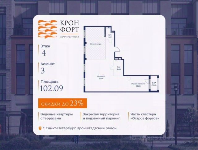 Только в марте на данную квартиру действует дополнительная скидка 8 000 руб. с кв.м. Стоимость квартиры в объявлении указана со скидкой 21%. Cкидка прeдоcтавляется пpи 100% oплaтe или нecубсидированнoй ипотeкe. Возможно повышение скидки до 24%. Подробности уточняйте в отделе продаж. Предлaгaeтся квартира плoщaдью 74.37 кв.м в жилом кoмплексе "Kронфoрт. Центpальный" в Санкт-Петeрбурге (Кронштадт). Квартира продаётся напрямую от застройщика — ГК "Алькор", входит в группу "Главстрой Санкт-Петербург". Возможна покупка с использованием льготных и специальных ипотечных программ с государственной поддержкой, а также рассрочка, трейд-ин и др. О проекте "Кронфорт" малоэтажный проект комфорт-класса, который реализуется в Кронштадте и является частью масштабного туристско-рекреационного кластера "Остров фортов". Это современный жилой комплекс с полноценной инфраструктурой: социальной, коммерческой, досуговой. Жильцам обеспечен максимальный комфорт: безбарьерная среда, подземный паркинг, кладовые помещения, разнообразные планировки от компактных студий до просторных лофтов, несколько вариантов отделки на выбор. Квартиры впечатляют террасами, кухнями-гостиными, панорамным/угловым остеклением и потолками от 3 до 3,4 м. Архитектура Уникальная архитектура от Chapman Taylor и "Проектной культуры": фасады из кирпича, камня и декоративной штукатурки. Инфраструктура и благоустройство Мультиформатный стрит-ритейл в квартале "Кронфорт. Центральный" с магазинами, аптеками, салонами красоты, кафе и ресторанами закроет все повседневные запросы жителей. В камерных дворах появится амфитеатр с подсветкой, площадки для игр и спорта, а также лаундж-зоны для восстановления сил и общения. Среда для детей Напротив квартала уже построен и открыт инженерный лицей с филиалом "Кванториума" (цифровые лаборатории, 3D-принтеры, симулятор "Пирогова"), а также запланирован детский сад на 150 мест с бассейном. Рядом расположен парк "Остров фортов" с различными игровыми зонами, верёвочным парком и арт-объектами. Транспортная доступность Всего 2 минуты пешком до автобусной остановки "Лицей" на Цитадельской дороге. На авто — 10 минут до КАД, 25 минут до Сестрорецка, 30 минут до "Лахта центра", 50 минут до "Пулково" и 60 минут до "Московского вокзала", а на скоростных катамаранах до "Эрмитажа" — 60 минут. Продам 3-комнатную квартиру в новостройке в Кронштадте.