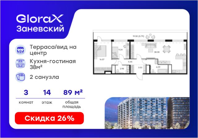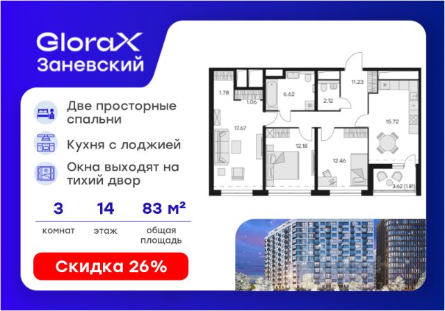 Продается 3-комн. квартира на 14-м этаже в проекте бизнес-класса GloraX Заневский. Общая площадь лота составляет 82,65 кв. м, из которых 42,31 кв. м отведено под жилую и 15,72 кв. м под кухонную зону. Номер квартиры - 246. Дом сдан. Ключи сразу! Преимущества квартиры: кухня-гостиная; гардеробная; 2 санузла. - Отделка White box - Увеличенные окна - Квартиры с террасами - Система "Умный дом" - IP-видеонаблюдение, Free Wi-fi на территории - Отапливаемый паркинг - Детская разновозрастная площадка - Комьюнити-центр для жильцов GloraX Заневский - современный комплекс бизнес-класса в шаговой в 2-х минутах от метро "Ладожская", для тех, кто не готов идти на компромиссы в вопросах комфорта и качества жизни. Мультифункциональный проект на 494 квартиры для стильных активных людей живущих в ритме большого города. GloraX Заневский располагается в экологически благоприятной локации. В пешей доступности находятся сад и 4 парка: парки Малиновка, Малоохтинский, Ладожский, Заневский и Яблоновский сад. У жителей мегаполиса есть уникальная возможность отвлечься от городской суеты и повседневных забот. 63 типа планировок от классических до евро-форматов, квартиры с террасами и уникальные квартиры с видом на динамичный Заневский проспект. Переменная этажность позволяет солнцу в равной степени освещать все квартиры, а увеличенная площадь остекления получить максимум дневного света. В проекте будет реализована собственная развитая инфраструктура: магазины и рестораны, детские площадки, фитнес-клуб, комьюнити-центр, уютные закрытый двор и прогулочный бульвар. GloraX Заневский не оставит равнодушными и любителей шоппинга, ведь всего в нескольких минутах пешей прогулки находятся крупные торговые галереи, кинотеатры, кафе и рестораны, среди которых ТЦ "Платформа", "Перрон", "Ладожские ряды", "Заневский каскад", "Нео", "Польза" и "Мебель Холл". GloraX Заневский это проект, использующий современные и технологичные решения, создающие комфорт и безопасность в повседневной жизни резидентов комплекса. Инновационная система "Умный дом" в жилом комплексе и в квартире обеспечивает согласованную работу всех инженерных систем и позволяют настраивать и опционально подключать необходимый дополнительный функционал. Для владельцев автомобилей мы спроектировали подземный отапливаемый паркинг на 295 машиномест, куда можно спуститься на лифте прямо со своего этажа. Цена указана при 100% оплате или стандартной ипотеке. Узнайте подробности в Отделе продаж. Продам 3-комнатную квартиру в новостройке рядом с метро Новочеркасская.