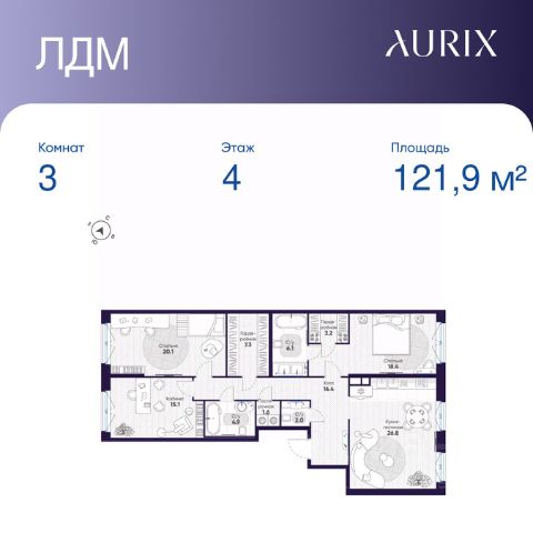 Продается 3-к квартира без отделки в ЖК "ЛДМ". Общая площадь квартиры — 121.9 кв. м, этаж 4 из 8. Тип дома — монолитный. Цена указана при 100% оплате.