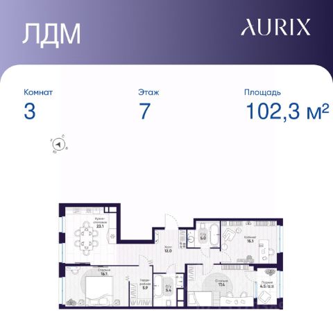 Продается 3-к квартира без отделки в ЖК "ЛДМ". Общая площадь квартиры — 102.3 кв. м, этаж 7 из 9. Тип дома — монолитный. Цена указана при 100% оплате.