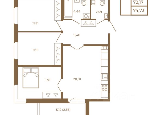 Трёхкомнатная квартира, обладает просторными комнатами, кухней-гостиной, двумя санузлами, с двумя балконами, большим коридором. Большое количество окон и большая площадь комнат при грамотном зонировании позволят Вам организовать отдельные помещения для каждого члена семьи.