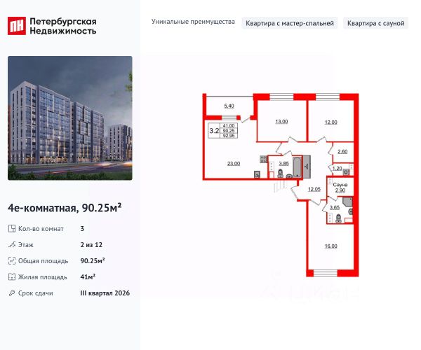 Продается уютная, семейная 3-комнатная квартира от застройщика в жилом комплексе "Бионика Заповедная" в динамичном Приморском районе. До метро можно добраться на транспорте всего за 11 минут. Мастер-спальня с собственной ванной комнатой. Самое приватное пространство в вашей квартире. Сауна в ванной комнате. Расслабьтесь и восстановите силы, как в СПА-салоне. Уникальная, функциональная европланировка, большая кухня-гостиная 23 м², просторная прихожая 12.05 м². Общая площадь квартиры - 90.25 м², жилая 41 м², высота потолка 2.77 м. Квартира продается с отделкой "Норд Лайн светлый плюс". Что особенного в ЖК "Бионика Заповедная"? • Оазис в городе 3 минуты пешком до Новоорловского заказника (140 ГА) • Захватывающие виды из окон на хвойный лесопарк • Всесезонный "Заповедный парк" во дворе площадью 23000 кв.м. • 5 единых входных групп с авторским дизайном и лаундж-зонами, сити-виллы на первых этажах с палисадниками и высотой потолков до 4 м • Места притяжения: фонтан "Бионика", спортивный кластер со скейт-парком, фотозоны с арт-объектами