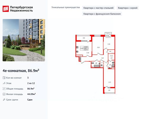 Продается уютная, семейная 3-комнатная квартира от застройщика в жилом комплексе "Прайм Приморский" в динамичном Приморском районе. До метро можно добраться на транспорте всего за 15 минут. Мастер-спальня с собственной ванной комнатой. Самое приватное пространство в вашей квартире. Сауна в ванной комнате. Расслабьтесь и восстановите силы, как в СПА-салоне. Французский балкон придает особенный европейский шик комнате. Уникальная, функциональная европланировка, большая кухня-гостиная 18.05 м², просторная прихожая 13.61 м². Общая площадь квартиры - 86.9 м², жилая 44.09 м², высота потолка 2.77 м. Квартира продается с отделкой "Норд Лайн серый комфорт". Что особенного в ЖК "Прайм Приморский"? • Живописные виды на Шуваловский карьер и лесной массив • "Парящие" французские балконы • Центральная входная группа • Креативное пространство в центре проекта, летняя терраса для отдыха • Приватные лаундж-зоны на крыше домов (3 корпус) 3-комнатная квартира в новостройке в округе Коломяги в Санкт-Петербурге.