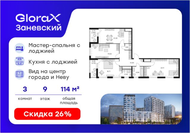 Продается 3-комн. квартира на 13-м этаже в проекте бизнес-класса GloraX Заневский. Общая площадь лота составляет 91,14 кв. м, из которых 52,13 кв. м отведено под жилую и 22,93 кв. м под кухонную зону. Номер квартиры - 236. Дом сдан. Ключи сразу! Преимущества квартиры: кухня-гостиная; гардеробная; 2 санузла. - Отделка White box - Увеличенные окна - Квартиры с террасами - Система "Умный дом" - IP-видеонаблюдение, Free Wi-fi на территории - Отапливаемый паркинг - Детская разновозрастная площадка - Комьюнити-центр для жильцов GloraX Заневский - современный комплекс бизнес-класса в шаговой в 2-х минутах от метро "Ладожская", для тех, кто не готов идти на компромиссы в вопросах комфорта и качества жизни. Мультифункциональный проект на 494 квартиры для стильных активных людей живущих в ритме большого города. GloraX Заневский располагается в экологически благоприятной локации. В пешей доступности находятся сад и 4 парка: парки Малиновка, Малоохтинский, Ладожский, Заневский и Яблоновский сад. У жителей мегаполиса есть уникальная возможность отвлечься от городской суеты и повседневных забот. 63 типа планировок от классических до евро-форматов, квартиры с террасами и уникальные квартиры с видом на динамичный Заневский проспект. Переменная этажность позволяет солнцу в равной степени освещать все квартиры, а увеличенная площадь остекления получить максимум дневного света. В проекте будет реализована собственная развитая инфраструктура: магазины и рестораны, детские площадки, фитнес-клуб, комьюнити-центр, уютные закрытый двор и прогулочный бульвар. GloraX Заневский не оставит равнодушными и любителей шоппинга, ведь всего в нескольких минутах пешей прогулки находятся крупные торговые галереи, кинотеатры, кафе и рестораны, среди которых ТЦ "Платформа", "Перрон", "Ладожские ряды", "Заневский каскад", "Нео", "Польза" и "Мебель Холл". GloraX Заневский это проект, использующий современные и технологичные решения, создающие комфорт и безопасность в повседневной жизни резидентов комплекса. Инновационная система "Умный дом" в жилом комплексе и в квартире обеспечивает согласованную работу всех инженерных систем и позволяют настраивать и опционально подключать необходимый дополнительный функционал. Для владельцев автомобилей мы спроектировали подземный отапливаемый паркинг на 295 машиномест, куда можно спуститься на лифте прямо со своего этажа. Цена указана при 100% оплате или стандартной ипотеке. Узнайте подробности в Отделе продаж. Продам 3-комнатную квартиру в новостройке на проспекте Энергетиков в Санкт-Петербурге.