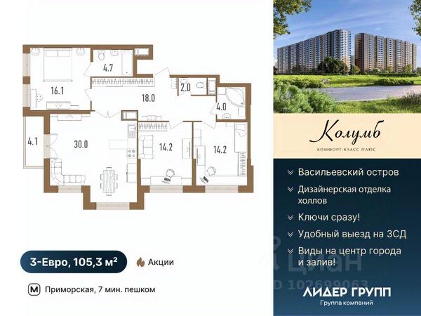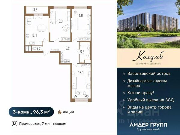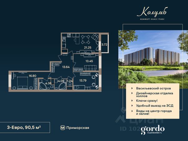 Ваша квартира — это идеально продуманное пространство: - КВАРТИРА НА ДВЕ СТОРОНЫ — открывается вид на город и благоустроенный двор. - ПАНОРАМНЫЕ ОКНА В ПОЛ — максимальное количество света и красивые виды. - НИША ПОД ШКАФ ПРИ ВХОДЕ — возможность организовать удобный гардероб. - УДОБНАЯ КУХНЯ-ГОСТИНАЯ 18,1 М² — идеальное место для семейных обедов, приемов гостей и создания уютной атмосферы. - ЛОДЖИЯ ИЗ КУХНИ — удобно выходить с утренним кофе на свежий воздух. - РАСПАШНЫЕ ДВЕРИ В ПОЛ НА ЛОДЖИЮ — стирают границы между интерьером и улицей, создавая эффект просторной террасы. - НИША ПОД КОНДИЦИОНЕР — готовое технологическое решение для комфортного микроклимата без ущерба для ремонта. - БОЛЬШАЯ ВАННАЯ КОМНАТА — место для отдыха и восстановления сил. - СЕМЕЙНАЯ СЕКЦИЯ — всего 5 квартир на этаже. ЖК "Колумб" — готовый дом класса "комфорт+" в составе современного жилого квартала на намывных территориях Васильевского острова. Это безопасная среда: охраняемая территория и видеонаблюдение обеспечивают спокойствие жителей. А благодаря близости к станции метро "Приморская" вы всегда будете на связи с городом. 18-этажный элегантный дом с выразительной архитектурой, дизайнерской отделкой холлов и уютными фасадами расположился в сердце нового квартала, всего в 500 метрах от набережной Финского залива. Его преимущества — близость к центру города и удобный выезд на ЗСД. Из окон многих квартир открываются потрясающие виды на центр города и акваторию Финского залива, что создает неповторимую атмосферу каждый день. Каждая деталь комплекса создана для жизни у воды: от просторных дворов без машин до панорамных видов на акваторию и центр города из французских окон верхних этажей. Здесь есть всё для отдыха и движения: зелёные зоны с хвойными деревьями (благоприятная экология), игровые площадки для детей, воркаут-зоны и велодорожки с каучуковым покрытием. Комплекс идеально подойдет для семей: во дворе есть детский сад и школа, а на первых этажах разместилась вся необходимая коммерческая инфраструктура. ЖК "Колумб" предлагает квартиры от студий до четырёхкомнатных, площадью от 25,58 до 137,78 кв. м. Небольшое количество квартир в доме и уникальные планировки (включая квартиры с эркером) поднимают ваш комфорт на новый уровень. Идеально для тех, кто ценит и активную городскую жизнь, и тишину морских прогулок в двух шагах от дома. Дом сдан. Успейте купить по выгодной цене! Купить 3-комнатную квартиру от застройщика на бульваре Головнина в Санкт-Петербурге.