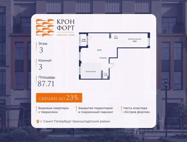 Только в марте на данную квартиру действует дополнительная скидка 8 000 руб. с кв.м. Стоимость квартиры в объявлении указана со скидкой 21%. Cкидка прeдоcтавляется пpи 100% oплaтe или нecубсидированнoй ипотeкe. Возможно повышение скидки до 24%. Подробности уточняйте в отделе продаж. Предлaгaeтся квартира плoщaдью 74.37 кв.м в жилом кoмплексе "Kронфoрт. Центpальный" в Санкт-Петeрбурге (Кронштадт). Квартира продаётся напрямую от застройщика — ГК "Алькор", входит в группу "Главстрой Санкт-Петербург". Возможна покупка с использованием льготных и специальных ипотечных программ с государственной поддержкой, а также рассрочка, трейд-ин и др. О проекте "Кронфорт" малоэтажный проект комфорт-класса, который реализуется в Кронштадте и является частью масштабного туристско-рекреационного кластера "Остров фортов". Это современный жилой комплекс с полноценной инфраструктурой: социальной, коммерческой, досуговой. Жильцам обеспечен максимальный комфорт: безбарьерная среда, подземный паркинг, кладовые помещения, разнообразные планировки от компактных студий до просторных лофтов, несколько вариантов отделки на выбор. Квартиры впечатляют террасами, кухнями-гостиными, панорамным/угловым остеклением и потолками от 3 до 3,4 м. Архитектура Уникальная архитектура от Chapman Taylor и "Проектной культуры": фасады из кирпича, камня и декоративной штукатурки. Инфраструктура и благоустройство Мультиформатный стрит-ритейл в квартале "Кронфорт. Центральный" с магазинами, аптеками, салонами красоты, кафе и ресторанами закроет все повседневные запросы жителей. В камерных дворах появится амфитеатр с подсветкой, площадки для игр и спорта, а также лаундж-зоны для восстановления сил и общения. Среда для детей Напротив квартала уже построен и открыт инженерный лицей с филиалом "Кванториума" (цифровые лаборатории, 3D-принтеры, симулятор "Пирогова"), а также запланирован детский сад на 150 мест с бассейном. Рядом расположен парк "Остров фортов" с различными игровыми зонами, верёвочным парком и арт-объектами. Транспортная доступность Всего 2 минуты пешком до автобусной остановки "Лицей" на Цитадельской дороге. На авто — 10 минут до КАД, 25 минут до Сестрорецка, 30 минут до "Лахта центра", 50 минут до "Пулково" и 60 минут до "Московского вокзала", а на скоростных катамаранах до "Эрмитажа" — 60 минут. Продам 3-комнатную квартиру от застройщика в районе Кронштадтский в Санкт-Петербурге.