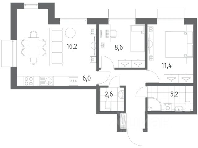 Дом монолитный, многоподъездный, переменной этажности, от 3 до 16 этажей. Квартира находится в 6-й секции высотой 7 этажей в корпусе 3-1. На этаже 5 квартир. В подъезде 2 грузовых лифта. Окончание строительства - 2 квартал 2028 года. Оформление сделки по договору долевого участия.