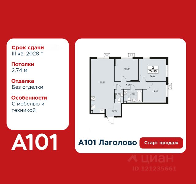 Старт продаж! 3-комнатная квартира площадью 71.68 в ЖК "А101 Лаголово" на 2 этаже. Квартира без отделки. Вид из окна во двор. В квартире 2 санузла. Высота потолков 2.74 м. Особенность планировки - гардеробная.