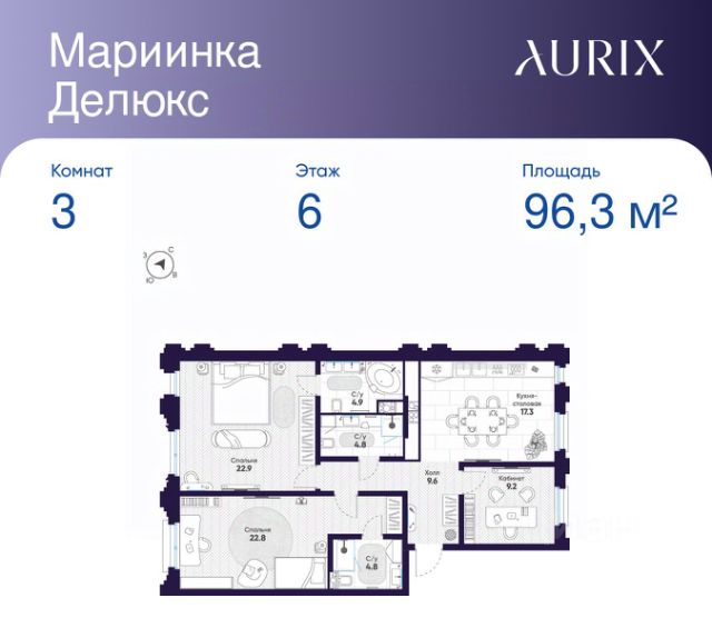 Продается 3-к квартира без отделки в ЖК "Мариинка Делюкс". Общая площадь квартиры — 96.3 кв. м, этаж 6 из 9. Тип дома — монолитный. Цена указана при 100% оплате.