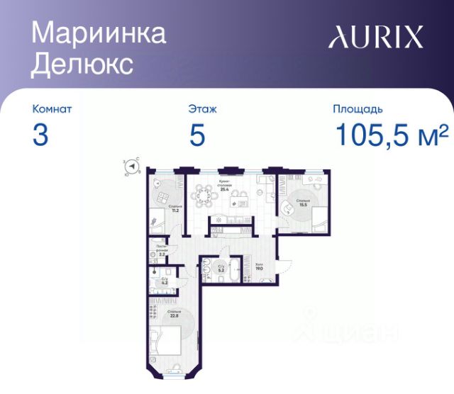 Продается 3-к квартира без отделки в ЖК "Мариинка Делюкс". Общая площадь квартиры — 105.5 кв. м, этаж 5 из 9. Тип дома — монолитный. Цена указана при 100% оплате.