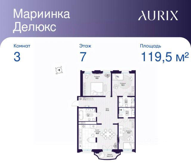 Продается 3-к квартира без отделки в ЖК "Мариинка Делюкс". Общая площадь квартиры — 119.5 кв. м, этаж 7 из 9. Тип дома — монолитный. Цена указана при 100% оплате.