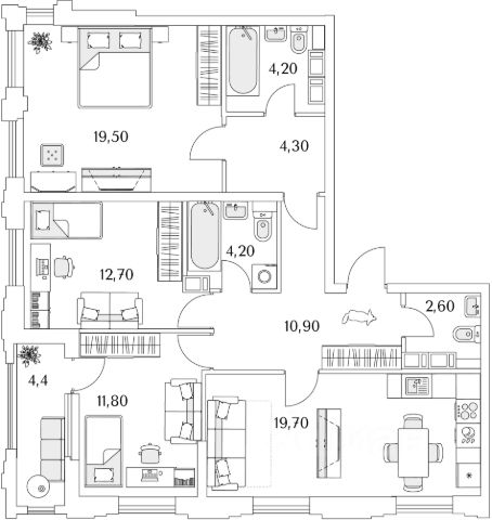 (Кухня: 17,07м2, Комнат 1: 10.15м2, Комната 2: 11,70м2, Комната 3: 9,92м2, С/у с Ванной 4.51 кв.м, С/у с душевой 3.22 кв.м, Гардеробная 2.30 кв.м., Холл 2.80 кв.м., Балкон 3,47 кв.м.)