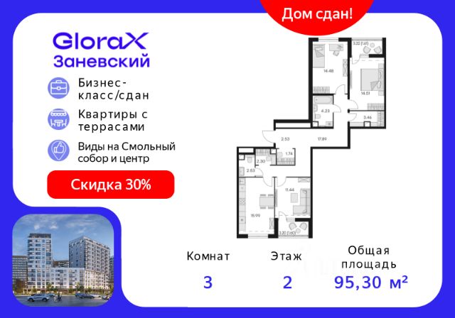 Продается 3-комн. квартира на 13-м этаже в проекте бизнес-класса GloraX Заневский. Общая площадь лота составляет 91,14 кв. м, из которых 52,13 кв. м отведено под жилую и 22,93 кв. м под кухонную зону. Номер квартиры - 236. Дом сдан. Ключи сразу! Преимущества квартиры: кухня-гостиная; гардеробная; 2 санузла. - Отделка White box - Увеличенные окна - Квартиры с террасами - Система "Умный дом" - IP-видеонаблюдение, Free Wi-fi на территории - Отапливаемый паркинг - Детская разновозрастная площадка - Комьюнити-центр для жильцов GloraX Заневский - современный комплекс бизнес-класса в шаговой в 2-х минутах от метро "Ладожская", для тех, кто не готов идти на компромиссы в вопросах комфорта и качества жизни. Мультифункциональный проект на 494 квартиры для стильных активных людей живущих в ритме большого города. GloraX Заневский располагается в экологически благоприятной локации. В пешей доступности находятся сад и 4 парка: парки Малиновка, Малоохтинский, Ладожский, Заневский и Яблоновский сад. У жителей мегаполиса есть уникальная возможность отвлечься от городской суеты и повседневных забот. 63 типа планировок от классических до евро-форматов, квартиры с террасами и уникальные квартиры с видом на динамичный Заневский проспект. Переменная этажность позволяет солнцу в равной степени освещать все квартиры, а увеличенная площадь остекления получить максимум дневного света. В проекте будет реализована собственная развитая инфраструктура: магазины и рестораны, детские площадки, фитнес-клуб, комьюнити-центр, уютные закрытый двор и прогулочный бульвар. GloraX Заневский не оставит равнодушными и любителей шоппинга, ведь всего в нескольких минутах пешей прогулки находятся крупные торговые галереи, кинотеатры, кафе и рестораны, среди которых ТЦ "Платформа", "Перрон", "Ладожские ряды", "Заневский каскад", "Нео", "Польза" и "Мебель Холл". GloraX Заневский это проект, использующий современные и технологичные решения, создающие комфорт и безопасность в повседневной жизни резидентов комплекса. Инновационная система "Умный дом" в жилом комплексе и в квартире обеспечивает согласованную работу всех инженерных систем и позволяют настраивать и опционально подключать необходимый дополнительный функционал. Для владельцев автомобилей мы спроектировали подземный отапливаемый паркинг на 295 машиномест, куда можно спуститься на лифте прямо со своего этажа. Цена указана при 100% оплате или стандартной ипотеке. Узнайте подробности в Отделе продаж. Купить 3-комнатную квартиру от застройщика на проспекте Энергетиков в Санкт-Петербурге.