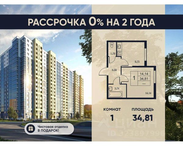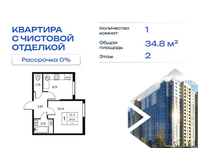 Квартира площадью 37,71 м², с комнатой 14,18 м² и просторной кухней 11,52 м². Санузел раздельный, есть лоджия. Расположена на первом этаже - удобно для семьи с детьми, пожилых людей или просто тех, кто не любит ждать лифт. Из окон открывается приятный вид на парк, рядом нет шумных дорог в квартире будет тихо и спокойно.
