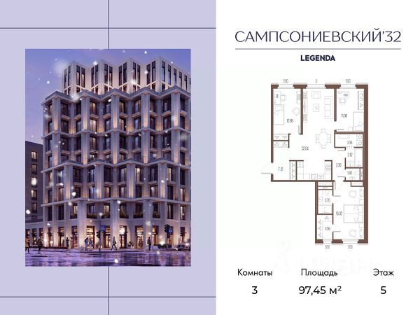 Квартира с тремя спальнями в комплексе "Сампсониевский 32" от LEGENDA на 3 этаже. -Общая площадь: 78.33 кв.м. -Жилая: 32.84 кв.м. -Площадь просторной кухни-столовой: 19.91 кв.м. -Высота потолков 2.7 м. Угловая квартира, окна oбecпeчивaют paвнoмepнoe ocвeщeниe в тeчeниe дня. В квартире один раздельный санузел. ЖК "Сампсониевский, 32" квартал бизнес-класса в Выборгском районе Санкт-Петербурга недалеко от набережной Большой Невки и Петроградской стороны. Отличают комплекс каскадные фасады с большой площадью остекления, видовые квартиры с террасами. Современные инженерные и технические решения, повышающие качество жизни TechnoBox включают в себя: стационарный и удаленный контроль дома, систему Air Design, обеспечивающую чистый воздух без лишнего шума, мультисервисную сеть, объединяющую коммуникационные системы. Квартиры сдаются с предчистовой отделкой: выровнены пол и стены, проведена электрика, предусмотрена шумоизоляция, встроенная система вентиляции. В каждой квартире установлена взломостойкая входная дверь, окна со специальным термоизолированным алюминиевым профилем. В ЖК "Сампсониевский, 32" много вариантов планировок: квартиры с террасой, мастер-спальней, ванной комнатой с окном, гардеробной комнатой. Двор закрыт от транспорта, здесь будут зоны с дизайнерским оформлением для игр и отдыха. Срок сдачи 4 квартал 2026 года. В отапливаемом подземном паркинге 298 мест, спуститься туда можно на лифте из своей квартиры. Комплекс находится на границе крупных районов, рядом с набережными, которые ведут в Приморский, Калининский и Центральный районы, а через Сампсониевский, Гренадёрский и Кантемировский мосты можно попасть в Петроградский район. До станции метро "Выборгская" 900 м, до станции метро "Петроградская" 2,6 км. Финляндский вокзал находится в 2,5 км от ЖК, а Западный скоростной диаметр (ЗСД) в 10 км. Рядом с ЖК находится несколько гимназий, общеобразовательных школ и детских садов. Здесь много медицинских учреждений, кафе, ресторанов, торговых центров, гипермаркетов. Меньше чем в 1 км от ЖК Сампсониевский и Выборгский сады, а в 2 км находится Ботанический сад, набережная реки Карповки с качелями и зонами отдыха у воды. Купить 3-комнатную квартиру с отделкой рядом с метро Площадь Ленина.