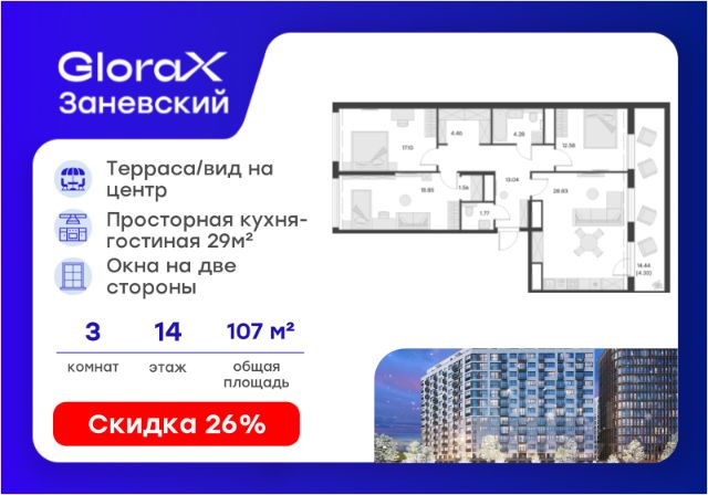 Продается 3-комн. квартира на 2-м этаже в проекте бизнес-класса GloraX Заневский. Общая площадь лота составляет 94,31 кв. м, из которых 40,43 кв. м отведено под жилую и 15,99 кв. м под кухонную зону. Номер квартиры - 1. Дом сдан. Ключи сразу! Преимущества квартиры: кухня-гостиная; гардеробная; 2 санузла. - Отделка White box - Увеличенные окна - Квартиры с террасами - Система "Умный дом" - IP-видеонаблюдение, Free Wi-fi на территории - Отапливаемый паркинг - Детская разновозрастная площадка - Комьюнити-центр для жильцов GloraX Заневский - современный комплекс бизнес-класса в шаговой в 2-х минутах от метро "Ладожская", для тех, кто не готов идти на компромиссы в вопросах комфорта и качества жизни. Мультифункциональный проект на 494 квартиры для стильных активных людей живущих в ритме большого города. GloraX Заневский располагается в экологически благоприятной локации. В пешей доступности находятся сад и 4 парка: парки Малиновка, Малоохтинский, Ладожский, Заневский и Яблоновский сад. У жителей мегаполиса есть уникальная возможность отвлечься от городской суеты и повседневных забот. 63 типа планировок от классических до евро-форматов, квартиры с террасами и уникальные квартиры с видом на динамичный Заневский проспект. Переменная этажность позволяет солнцу в равной степени освещать все квартиры, а увеличенная площадь остекления получить максимум дневного света. В проекте будет реализована собственная развитая инфраструктура: магазины и рестораны, детские площадки, фитнес-клуб, комьюнити-центр, уютные закрытый двор и прогулочный бульвар. GloraX Заневский не оставит равнодушными и любителей шоппинга, ведь всего в нескольких минутах пешей прогулки находятся крупные торговые галереи, кинотеатры, кафе и рестораны, среди которых ТЦ "Платформа", "Перрон", "Ладожские ряды", "Заневский каскад", "Нео", "Польза" и "Мебель Холл". GloraX Заневский это проект, использующий современные и технологичные решения, создающие комфорт и безопасность в повседневной жизни резидентов комплекса. Инновационная система "Умный дом" в жилом комплексе и в квартире обеспечивает согласованную работу всех инженерных систем и позволяют настраивать и опционально подключать необходимый дополнительный функционал. Для владельцев автомобилей мы спроектировали подземный отапливаемый паркинг на 295 машиномест, куда можно спуститься на лифте прямо со своего этажа. Цена указана при 100% оплате или стандартной ипотеке. Узнайте подробности в Отделе продаж. Продам 3-комнатную квартиру первичка в районе Красногвардейский в Санкт-Петербурге.