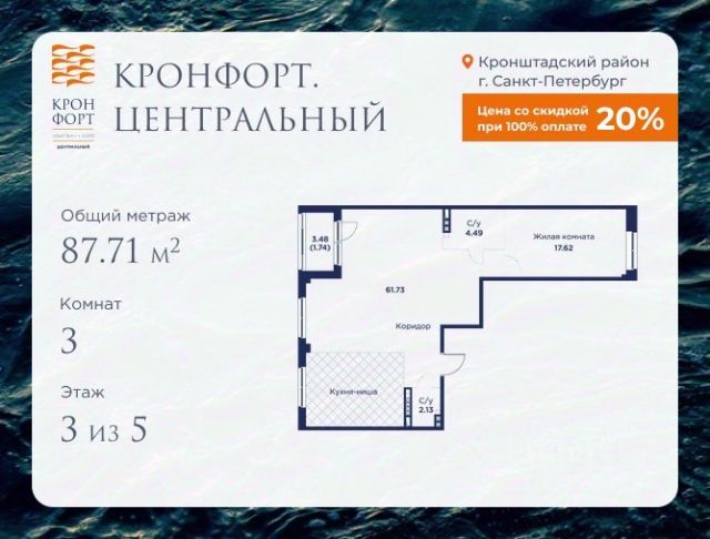 Стоимость квартиры указана со скидкой 20%. Скидка предоставляется при 100% оплате или несубсидированной ипотеке. Предлагается квартира площадью 79.41 кв.м в жилом комплексе "Кронфорт. Центральный" в Санкт-Петербурге (Кронштадт). Возможна покупка с использованием льготных и специальных ипотечных программ с государственной поддержкой. Высота потолков в квартирах — от 3 до 3,4 метров, окна увеличенного размера, есть варианты с эркерами, французскими балконами, лоджиями и террасами. Жилой квартал состоит из пяти четырехэтажных корпусов с закрытыми охраняемыми дворами, свободными от машин. Первые этажи формируют торговые променады в стиле пешеходных улиц исторической части Петербурга и Кронштадта. Внутренние пространства между корпусами — пешеходные зоны с уютными площадями. Архитектурный облик квартала разработан бюро "Проектная культура" и международной компанией Chapman Taylor. Инфраструктура комплекса включает: - Лицей с двумя бассейнами - Детский сад на 150 мест с бассейном и закрытой территорией - Веревочный парк - Игровые площадки для активного отдыха; - Кабинет врача общей практики. - Подземные паркинги с лифтами. - Мусоросборные камеры, индивидуальные кладовые. - Закрытые дворы с контролем доступа и видеонаблюдением. - Мультформатный стрит-ретейл с кафе и ресторанами. - Триатлон-центр и беговые/велодорожки. - Учебно-тренировочный комплекс для детей "Лагерь настоящих героев". Транспортная доступность обеспечивает удобный выезд на КАД (около 1-3 км), 2 минуты пешком до автобусной остановки "Лицей", 25 минут до Сестрорецка, 30 минут до "Лахта-центра", 50 минут до аэропорта "Пулково" и 60 минут до Московского вокзала. Для любителей моря доступен маршрут на "Метеоре" до центра Санкт-Петербурга. Отделка квартир предлагается как с готовой чистовой отделкой, так и со свободной планировкой без отделки для реализации индивидуальных дизайнерских решений. В третьем корпусе, продажи которого стартовали в марте 2025 года, доступны квартиры с просторными террасами, тремя балконами, кухнями-гостиными до 38 кв.м с окнами на две стороны, обеспечивающими панорамное освещение и виды. Если вам нужна помощь с оформлением ипотеки или дополнительная информация по комплексу и условиям покупки, обращайтесь в отдел продаж за консультацией. Продам 3-комнатную квартиру первичка в Кронштадте.