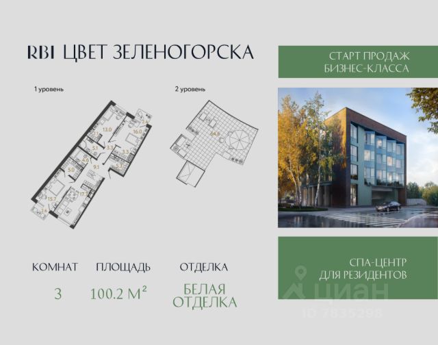 Просторная трехкомнатная квартира - Family- формат, в которой продумана каждая деталь для проживания семьи. Особенности лота: вид на лес панорамные окна потолки 3 м мастер-спальня большая кухня-гостиная постирочная гардеробная три санузла отделка White Box. ИНДИВИДУАЛЬНЫЕ УСЛОВИЯ РАССРОЧКИ! ВЫГОДНАЯ ЦЕНА ПРИ 100% ОПЛАТЕ! Загородная жизнь с городским комфортом! Малоэтажный ЖК и небольшое количество квартир на этажах создают атмосферу приватной резиденции. В ЖК бизнес-класса Ranta Residence нет студий: все квартиры имеют площадь от 36 м² до 99 м². Прописка Санкт-Петербург. БЛАГОУСТРОЙСТВО Закрытая охраняемая территория, современный ландшафтный дизайн от студии L.Buro, натуральные материалы в обустройстве, а также резидентам ЖК будут доступны: теннисный корт на крыше паркинга; коворкинг под открытым небом; финский павильон с живым очагом и шезлонгами; павильон с барбекю; гамаки, скамейки и лежаки; спортивные и детские площадки; три прогулочные аллеи, амфитеатр; водный арт-объект; сад скульптур и пряных трав. ИНФРАСТРУКТУРА Мы создаём атмосферу закрытого клуба и интересного комьюнити, только для резидентов ЖК будут доступны: Бэби-клуб с детской комнатой и заботливой няней; Спортивный зал с тренажерами; Зал для йоги и стретчинга; Коворкинг; Кофейня; Собственный детский сад и начальная школа. В пешей доступности расположены: ТЦ Курортный Продуктовые магазины Перекресток и Пятерочка Аптека Кафе быстрого питания 4 школы и 3 детских сада Взрослая и детская поликлиники Рестораны и парки. ЛОКАЦИЯ ЖК бизнес-класса Ranta Residence расположен в экологически чистом Курортном районе Санкт-Петербурга, занимает участок площадью 5,4 Га по адресу: г. Санкт-Петербург, г. Зеленогорск, ул. Кривоносовская 57Д. ЖК Ranta Residence граничит с лесным массивом, также поблизости находятся: Государственный природный заказник "Озеро Щучье"; Золотой пляж; Комаровский берег; Зеленогорский парк культуры и отдыха; Горнолыжный курорт Пухтолова гора всего в 15 минутах на автомобиле . Съезда на ЗСД находится в 18 км, до ближайшей станции метро Беговая путь на автомобиле займет в среднем 50 минут, а до центра Санкт-Петербурга путь составит в среднем 60 минут. От ЖК Ranta Residence до центра Санкт-Петербурга около 60 км (по Зеленогорскому или Приморскому шоссе — они идут параллельно). До "Лахта-центра" 45 км и 45 минут в пути. В 15 минутах от ЖК на Вокзале Зеленогорск можно сесть на Ласточку, которая за 55 минут доезжает до Финляндского вокзала, там же есть автобусная остановка, от которой можно доехать к станциям метро Беговая и Черная речка" - этот путь займёт около 1,5 часа. Хотите узнать подробности? Звоните в Отдел продаж, наши специалисты ответят на все интересующие вас вопросы! #Зеленогорск, #Курортный район, просторная планировка, #малоэтажный, закрытый охраняемый двор, #бизнес-класс, панорамные окна, потолки 3 метра. 3-комнатная квартира первичка в Зеленогорске.