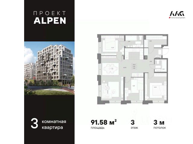 Квартира с тремя спальнями в комплексе "Сампсониевский 32" от LEGENDA на 3 этаже.