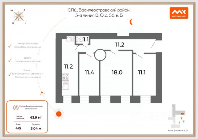 Идеальное расположение: вход с проспекта, окна - в зеленый двор, шаговая доступность к метро "Горный институт" (всего 7 минут неспешным шагом), автобусной/троллейбусной остановкам (1 минута), кафе, булочным, школам, детским садам, Василеостровскому и Опочининскому садам, популярному досуговому пространству Севкабель (10 минут).