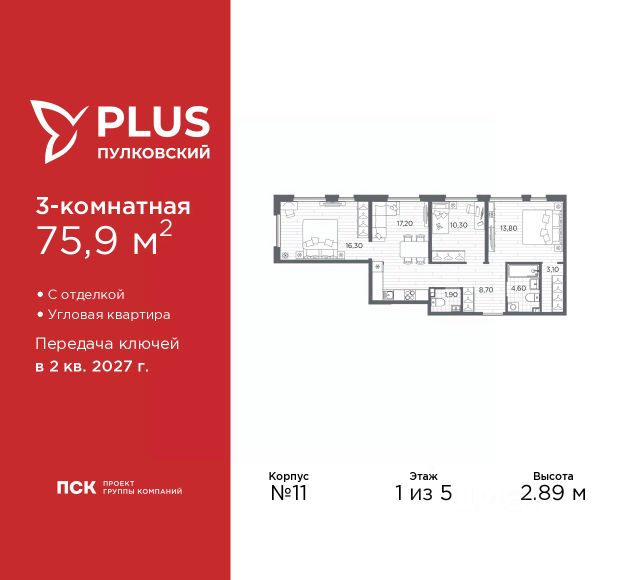 3 комнатная квартира , 10 минут пешком от м. Московская