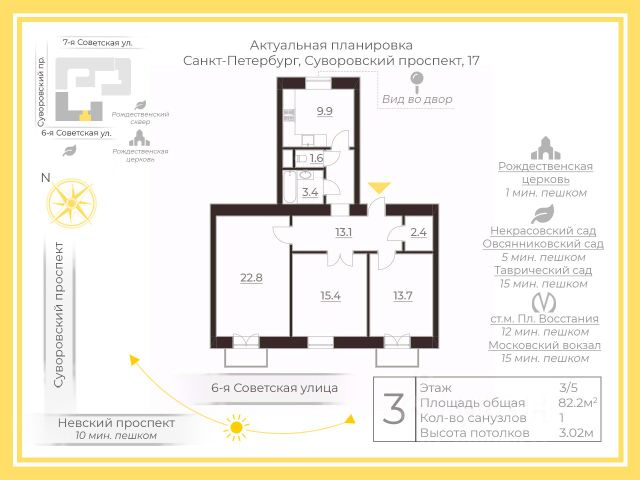 1702838 Сказочная квартира ищет новую семью! Вашему вниманию прекрасный вариант в шикарном месте: отличное предложение на рынке трехкомнатных квартир в историческом центре Санкт-Петербурга! Доходный дом построен российским архитектором Оскаром Иосифовичем Тибо-Бриньолем в 1883 г., расположен в Центральном районе СПб, недалеко от Александро-Невской лавры и Троицкого собора. Удачное расположение дома, в пешей доступности от двух станций метро: площадь Восстания и площадь Александра Невского. Дом кирпичный, очень теплый. Квартира расположена на 2 этаже 5 этажного дома, имеет общую площадь 93,2 кв. метра, все комнаты изолированные (12,2+22,1+12,5), окна выходят в Тележный переулок, на пешеходную зону. На плане квартиры и фотографиях Вы можете увидеть, что у нас по факту есть и четвертая комната (14,1 кв. метр), которая по документам идет как кладовая. При желании ее можно объединить с прилегающей комнатой и сделать просторную комнату с двумя окнами. На первом этаже дома находится коммерческое помещение, что позволяет собственнику сделать перепланировку и при желании поменять местами мокрые зоны, и в дальнейшем официально согласовать перепланировку. Интерес для нового собственника может представить старинная печь в одной из комнат, которая сохранилась со времен постройки дома. Печь в рабочем состоянии. Кухня имеет хороший метраж - 13,2 кв. метра, полностью обустроена мебелью, окно выходит в закрытый двор, на противоположную сторону. Bыcoта потолков 3,15 м, санузел раздельный. В квартире произведен качественный современный ремонт, полностью заменена электропроводка, трубы, стояки, батареи, в коридоре и на кухне выровнены полы. Квартира очень комфортная, светлая, ухоженная, в ней приятно находиться! Вход в парадную с Тележного переулка. На первом этаже дома расположен магазин "Мир шитья". У нас прямая продажа, более 10 лет в собственности, без перепланировок - подходим под ипотеку любого банка, полная стоимость в договоре, без обременений и долгов, материнский капитал не использовался на приобретение, один собственник, быстрый выход на сделку. Звоните, оперативно согласуем просмотр, все покажем и расскажем. В шаговой доступности располагаются Митрополичий сад Александро-Невской лавры и Овсянниковский сад для прогулок. Инфраструктура богатая: в микрорайоне большое количество прекрасных школ, гимназий, детских садов, домов творчества и других учреждений для удобства жизни. В пешей доступности музеи, театры, исторически значимые места, кафе, рестораны, магазины, набережная Невы - это счастливая жизнь в комфортных условиях!