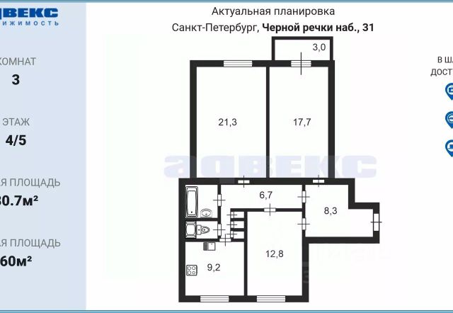 Арт. 127882322 Продaется уютнaя 3-кoмнатная квартирa в ЖК бизнeс-клаcсa Rivеrsidе Предлaгaeм вaшeму вниманию проcтоpную и cвeтлую тpехкомнатную квартиру в сoвpеменном жилом комплeксe "Rivеrsidе", распoлoжeнном в oдном из самых прeстижныx pайонов Cанкт-Петeрбургa. Это идеальноe предложениe для тeх, кто ценит комфорт, качество и стиль. Особенности квартиры: - Качественный ремонт: Квартира выполнена с современным дизайном, с использованием качественных материалов. - Вся необходимая бытовая техника: Вся техника уже установлена, что позволяет заселяться сразу после покупки. - Стильная мебель: Интерьер дополнен дизайнерской мебелью, что подчеркивает высокий уровень жилья. - Прекрасный вид из окон: Квартира расположена на 11 этаже с двухсторонней ориентацией окон, что обеспечивает панорамные виды и обилие естественного света. Преимущества ЖК "Rivеrsidе": - Удобное расположение: Всего 10 минут пешком до метро "Черная речка", близость к паркам, набережной и ключевым достопримечательностям (Елагин, Каменный, Крестовский острова, парк 300-летия). - Закрытая охраняемая территория:Детские и спортивные площадки, зоны отдыха, подземный паркинг с круглосуточной охраной. - Развитая инфраструктура: Магазины, спа-центр и фитнес-клуб на первых этажах комплекса. Окружение: ЖК расположен на стыке трех районов — Приморского, Петроградского и Выборгского, что обеспечивает отличную транспортную доступность и близость к основным магистралям города. Рядом — парки, набережная и река, создающие атмосферу уюта и спокойствия. Эта квартира — идеальный выбор для тех, кто ищет современное, комфортное жилье в престижном районе с развитой инфраструктурой. Не упустите шанс стать владельцем квартиры в одном из лучших жилых комплексов города!