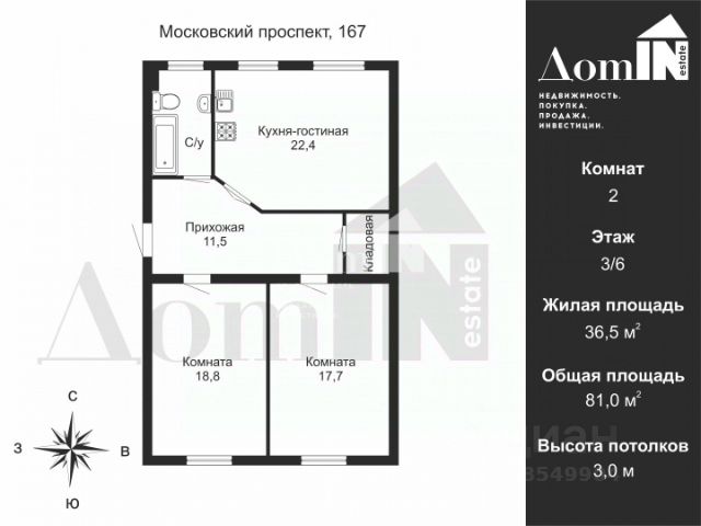 Квартира площадью 132,5 м2 расположена на 6 этаже в семиэтажном доме в Московском районе. В квартире функциональная планировка: светлая кухня-гостиная 33,6 м2 с эркером и зимним садом, уютные тихие спальни с окнами во двор и собственными гардеробными 23,3 + 22,5 м2, 2 санузла (+ постирочная), спальня-кабинет (свободное назначение) 15,5 м2. Высота потолков 3,0 м.