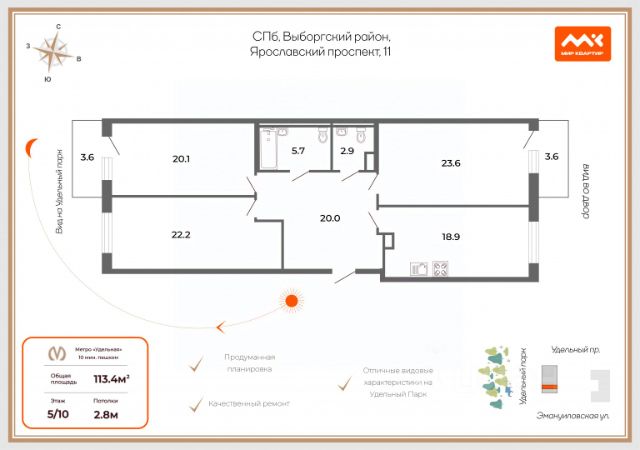 Продается уникальная квартира в живописном и экологически чистом районе на севере Санкт-Петербурга! Эта квартира идеальный выбор для семей с детьми, которые ценят комфорт и высокое качество жизни. Дом расположен на краю парка Сосновка, что делает его настоящим оазисом природы в городской суете. Основные преимущества: Прекрасная экология: микрорайон отличается чистым воздухом и зелеными насаждениями. Развитая инфраструктура: в шаговой доступности находятся престижные гимназии, детские сады и магазины, что обеспечит вам и вашим детям все необходимое для комфортной жизни. Квартира находится в собственности одной семьи с момента постройки дома в 2003 году. Это гарантирует надежность и ухоженность. Описание квартиры: Все комнаты изолированные, что обеспечивает максимальный комфорт и приватность. Удобная гардеробная для хранения вещей. Просторная лоджия площадью 8 кв.м (не входит в общую площадь квартиры), идеально подходящая для отдыха или работы. Транспортная доступность: Всего 30 минут на машине до курортов Финского залива, что делает ваши выходные особенными. До центра Санкт-Петербурга всего 30 минут на общественном транспорте возможность насладиться всеми прелестями городской жизни в считанные минуты.