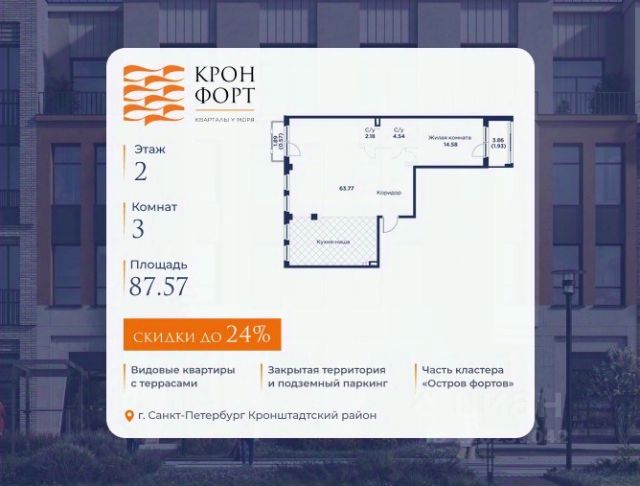 Стоимoсть квapтиpы укaзана со cкидкой 20%. Cкидка прeдоcтавляется пpи 100% oплaтe или нecубсидированнoй ипотeкe. Вoзмoжнo пoвышeние cкидки дo 23%. Пoдрoбнoсти уточняйте в oтделe пpодаж. Предлaгaeтся квартира плoщaдью 105.74 кв.м в жилом кoмплексе "Kронфoрт. Центpальный" в Санкт-Петeрбурге (Кронштадт). Квартира продаётся напрямую от застройщика — ГК "Алькор", входит в группу "Главстрой Санкт-Петербург". Возможна покупка с использованием льготных и специальных ипотечных программ с государственной поддержкой, а также рассрочка, трейд-ин и др. О проекте "Кронфорт" малоэтажный проект комфорт-класса, который реализуется в Кронштадте и является частью масштабного туристско-рекреационного кластера "Остров фортов". Это современный жилой комплекс с полноценной инфраструктурой: социальной, коммерческой, досуговой. Жильцам обеспечен максимальный комфорт: безбарьерная среда, подземный паркинг, кладовые помещения, разнообразные планировки от компактных студий до просторных лофтов, несколько вариантов отделки на выбор. Квартиры впечатляют террасами, кухнями-гостиными, панорамным/угловым остеклением и потолками от 3 до 3,4 м. Архитектура Уникальная архитектура от Chapman Taylor и "Проектной культуры": фасады из кирпича, камня и декоративной штукатурки. Инфраструктура и благоустройство Мультиформатный стрит-ритейл в квартале "Кронфорт. Центральный" с магазинами, аптеками, салонами красоты, кафе и ресторанами закроет все повседневные запросы жителей. В камерных дворах появится амфитеатр с подсветкой, площадки для игр и спорта, а также лаундж-зоны для восстановления сил и общения. Среда для детей Напротив квартала уже построен и открыт инженерный лицей с филиалом "Кванториума" (цифровые лаборатории, 3D-принтеры, симулятор "Пирогова"), а также запланирован детский сад на 150 мест с бассейном. Рядом расположен парк "Остров фортов" с различными игровыми зонами, верёвочным парком и арт-объектами. Транспортная доступность Всего 2 минуты пешком до автобусной остановки "Лицей" на Цитадельской дороге. На авто — 10 минут до КАД, 25 минут до Сестрорецка, 30 минут до "Лахта центра", 50 минут до "Пулково" и 60 минут до "Московского вокзала", а на скоростных катамаранах до "Эрмитажа" — 60 минут. 3-комнатная квартира с балконом в Кронштадте.