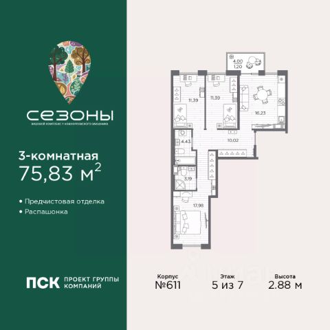 Продается трехкомнатная квартира с предчистовой отделкой в ЖК "Сезоны" на 4 этаже. Общая площадь: 72.73 кв.м., жилая: 34.12 кв.м., площадь просторной кухни-столовой: 18.84 кв.м. Квартира угловая, идеально подойдет любителям тишины и панорамных видов. В квартире один балкон, два совмещенных санузла. Высота потолков 2.88 м. Дом монолитный, многоподъездный, высотой 7 этажей. Квартира находится в 1-й секции в корпусе 611. На этаже 4 квартиры. В подъезде 1 грузовой лифт. Начало строительства - 4 квартал 2025 года. Окончание строительства - 2 квартал 2028 года. Оформление сделки по договору долевого участия. Видовой жилой комплекс "Сезоны" от ГК ПСК возводится в одном из самых востребованных и престижных районов Санкт-Петербурга - Приморском, рядом с Суздальским и Выборгским шоссе. Такое расположение обеспечивает удобный выезд в разные части города, сочетая городской комфорт с близостью к природе. Всего в 50 метрах находится природный заказник "Новоорловский" и речка Каменка, а в пешей доступности - Суздальские озёра. Приморский район отличается развитой социальной и транспортной инфраструктурой. Здесь расположены крупные торговые и деловые центры, современные спортивные объекты, медицинские учреждения, магазины, кафе и рестораны. Комплекс включает четыре корпуса, ввод которых в эксплуатацию запланирован на 2028 год. Проект и прилегающий микрорайон разработаны в соответствии с концепцией "15-минутного города", при которой вся необходимая инфраструктура находится в шаговой доступности. В ближайшем окружении - две школы, пять детских садов, магазины, кафе, салоны красоты, банковские отделения и пункты выдачи заказов. Также предусмотрены два четырёхъярусных паркинга с лифтами на 288 машиномест. О застройщике ГК ПСК - один из крупнейших девелоперов Санкт-Петербурга с более чем 18-летней историей. Компания реализует проекты во всех сегментах недвижимости - от премиальных жилых комплексов до масштабных кварталов комфорт-класса и апарт-отелей. По данным портала ЕРЗ.РФ, ПСК входит в ТОП-3 крупнейших застройщиков Санкт-Петербурга по объёму текущего строительства. Портфель компании превышает 3 млн кв. м жилой и коммерческой недвижимости. Все объекты сдаются строго в срок и отличаются высоким уровнем архитектурных и инженерных решений. #Z7oovt