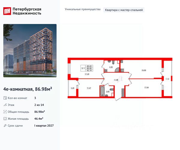 Продается уютная, семейная 3-комнатная квартира от застройщика в жилом комплексе "Город звезд" в новом городе на правом берегу Невы. До метро можно добраться на транспорте всего за 13 минут. Мастер-спальня с собственной ванной комнатой. Самое приватное пространство в вашей квартире. Уникальная, функциональная европланировка, большая кухня-гостиная 19.76 м², просторная прихожая 11.94 м². Общая площадь квартиры - 86.98 м², жилая 46.4 м², высота потолка 2.75 м. Квартира продается с отделкой "NORD LINE SILVER". Что особенного в ЖК "Город звезд"? • Инновационный Лицей Setl с оригинальной архитектурной концепцией и уникальной образовательной средой • Невский лесопарк под окнами - всегда свежий воздух и полноценный отдых на природе • Четыре тематические площади отдыха с разнообразным благоустройством • Аллея Звёзд - променад протяженностью 5 км с ландшафтным озеленением, зонами отдыха и велодорожкой • Выход на набережную реки Утки, где можно порыбачить или взять напрокат лодку • Единая входная группа с ресепшен и подземный паркинг