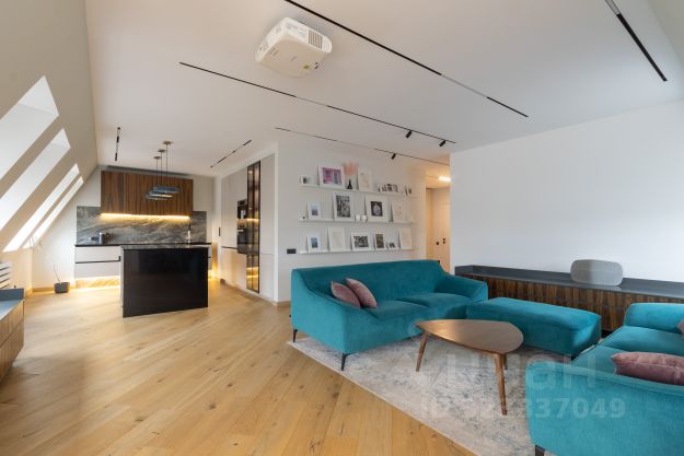 Настоящая зона притяжения в квартире, грамотно зонированная для проведения вечеров за просмотром фильмов на огромном экране (установлен проектор Panasonic), дружеских встреч, семейных трапез, и быстрых завтраков за островом.