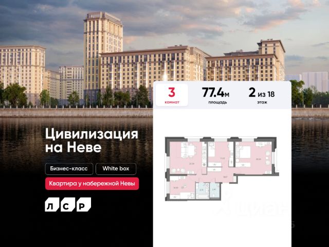 Цена действует при 100% оплате и на определенные ипотечные программы. Подробности — в отделе продаж по телефону. Продаётся 3-комнатная квартира в ЖК "Цивилизация на Неве" на 2 этаже. Общая площадь составляет 77.40 кв. м. Квартира с white box отделкой. Жилой комплекс "Цивилизация на Неве" располагается по адресу Санкт-Петербург, Невский. "Цивилизация на Неве" - видовые дома бизнес-класса, расположенные вдоль набережной Невы, всего в 7 км от исторического центра. Жилой комплекс идеально выражает особый дух, свойственный знаменитым просторным кварталам постройки сталинской эпохи в Москве и на Московском проспекте в Петербурге. Расположение: • 15 мин на авто до Невского проспекта; • 15 мин на авто до Московского вокзала; • 5 мин на авто до станции метро "Улица Дыбенко"; • 14 мин (7 км) до КАД. Уникальный дизайн входных зон, закрытая территория, видеонаблюдение и охрана, подземный паркинг с лифтом и другие особенности проекта отвечают заявленному классу. В каждом дворе предусмотрено озеленение по индивидуальному ландшафтному проекту с благородными растениями и кустарниками. Преимущества: • Закрытая территория с видеонаблюдением; • Подземный паркинг с лифтом; • Детская площадка на приватной безопасной территории; • Несколько детских садов и школ; • Инфраструктура шаговой доступности на первых этажах корпусов. Успейте приобрести квартиру на выгодных условиях! Чтобы узнать подробности, обращайтесь за консультацией по телефону.