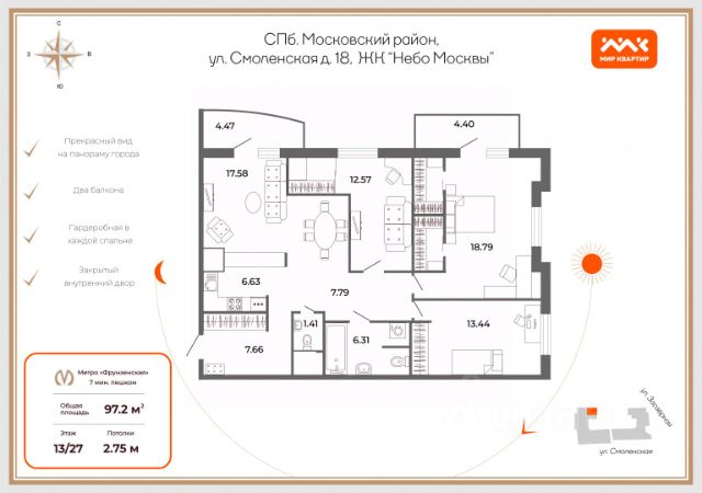 Трехкомнатная квартира с отделкой в ЖК "ORO by Akvilon" на 3 этаже. Общая площадь: 78.59 кв.м., жилая: 35.39 кв.м., площадь просторной кухни-столовой: 17.89 кв.м. Комнаты изолированные, все окна выходят на одну сторону. В квартире одна лоджия, один совмещенный и один раздельный санузел. Высота потолков 2.85 м. Квартира находится в корпусе 1. Дом монолитный, одноподъездный, высотой 17 этажей. На этаже 12 квартир. В подъезде 1 пассажирский и 1 грузовой лифт. Окончание строительства - 4 квартал 2027 года. Оформление сделки по договору долевого участия. В шаговой доступности от дома расположена станция метро (расстояние по прямой) "Звёздная" (800 м), также недалеко от этого корпуса расположены станции метро: "Купчино", "Московская", "Ленинский Проспект", "Дунайская". ЖК "ORO by Akvilon" - старт продаж жилого комплекса бизнес-класса в Московском районе. -Панорамные окна в пол во всех квартирах -Алюминиевые оконные профили с многокамерными стеклопакетами -Французские балконы с золотой окантовкой -Высота этажа 3,15 метра -Увеличенные дверные проемы - 2,3 метров высотой -Выделенные места для кондиционеров на каждом этаже -Фреоновые трубки заведенные в квартиру от мест установки внешних блоков кондиционеров -Дизайнерская отделка гранд-лобби с биокамином и золотыми элементами -Импортные бесшумные лифты с дизайнерской отделкой и увеличенной высотой кабины Отделка квартир Премиальная отделка в двух цветовых решениях: Beigestone и Greystone. Дозаказ для любой квартиры Стандарты Группы Аквилон для вашей комфортной жизни Thermo-S экономия на коммунальных платежах за счет дополнительно утепленных стен, кровли и цоколя. Энергоэффективные окна с селективным покрытием и аргоновым заполнением Soundstop - дополнительная шумоизоляция внутренних перегородок и межэтажных перекрытий, шумозащитные окна, малошумные лифты Light-in - в квартирах комфортный микроклимат. Многокамерные стеклопакеты сохраняют тепло зимой и отсеивают излишки излучения солнечного света летом, сохраняя прохладу в помещении. Vent-in - в каждой комнате есть клапаны индивидуальной вентиляции, которые обеспечивают приток свежего воздуха с улицы. inHOME умный дом в каждой квартире Интеллектуальная цифровая система, которая позволит дистанционно решать бытовые вопросы, управлять квартирой и экономить на оплате коммунальных услуг. В состав inHOME входят: IP-домофон, Face key, "умные" счетчики, датчики протечки, дистанционное отключение розеток, и т.д. Подземный паркинг -Лифты в каждой секции со спуском в паркинг -Отделка лифтовых холлов паркинга в стиле Гранд лобби + дизайнерская навигация самого паркинга -Возможность установки электрозарядки в паркинге или на территории ЖК -GSM усилитель в паркинге Двор -Ландшафтный дизайн с геопластикой и цветочными аркадами -Сад цветущих сезонов -Разноуровневая подсветка -Детские площадки нового поколения -Живой зелёный забор -Закрытый двор без машин Локация -7 мин. до м. Звездная -10 мин. до м. Московская -15 мин. до
