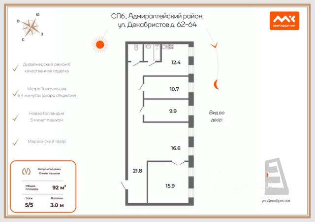 Арт. 131592069 Квартира у Мариинского театра Вода под окнами, свет софитов Мариинки в ночи и полная тишина — это не сон, а реальность в самом центре Петербурга. На набережной Крюкова канала, в тени Николаевского сада и Новой Голландии, открывается уникальная возможность: стать частью истории в доме купца Брагина. Эта трёхкомнатная квартира (140 м²) на высоком втором этаже — ода эстетике и комфорту. В чём магия этого места? 1. Романтика уходящего Петербурга: Из 53-метровой кухни-гостиной с тремя окнами открывается вид, который вдохновлял поэтов Серебряного века. Крюков канал здесь не широк и параден — он уютен и камерен. Глядя на его тихую гладь, кажется, что время замедляет ход, а по мостикам вот-вот пройдут тени Достоевского или Ахматовой. Это не просто вид на воду — это вид на душу старого Петербурга. 2. Свет и высота: Потолки 3,6 метра и панорамные окна наполняют квартиру воздухом. Алюминиевые конструкции пропускают максимум света, сохраняя тепло и тишину. 3. Дом с биографией: Четырехэтажное здание с мощными железобетонными перекрытиями (капремонт 1962 года) прошло реставрацию. Соседи — известные и интеллигентные люди, ценящие уединение. 4. Интерьер для гурманов: Здесь всё продумано до мелочей. Полы: керамогранит Porcelanosa и паркет из ценной древесины. Техника и сантехника: немецкая Axor, итальянская Bossini. Свет: дизайнерские светильники AWG. Воздух: климат-контроль (кондиционеры + бризеры). Мощность: увеличенные 15 кВт для любых инженерных решений. 5. Ванная как произведение искусства: Представьте расслабление в ванне с видом на петербургское небо или старинные крыши — это главный сюрприз этой квартиры. В объявлении использованы изображения, сгенерированные нейросетью. Они передают атмосферу и стиль отделки, которая ждет вас. Квартира поставляется без мебели — это пространство, готовое принять ваш характер и вкус. Юридическая чистота, один собственник, отсутствие прописанных лиц. Приходите смотреть, пока солнце освещает эти стены.