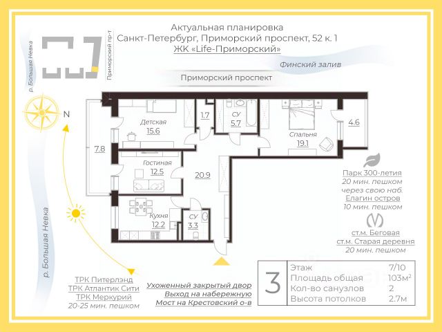 Эксклюзивная квартира современного формата 3-Евро 110 м2, вид с лоджии на реку Большая Невка и Каменный остров, две большие спальни 16,1 м2 и 15,3 м2, просторная гостиная 36,6 м2 и элегантная кухня-столовая 16,9 м2. В квартире 5 окон, на закаты над Газпром-Ареной и залитый утренними лучами солнца Ушаковский мост. Два санузла, с душевой и ванная комната, просторный хол 13,2 м2 с объёмной гардеробной зоной хранения.