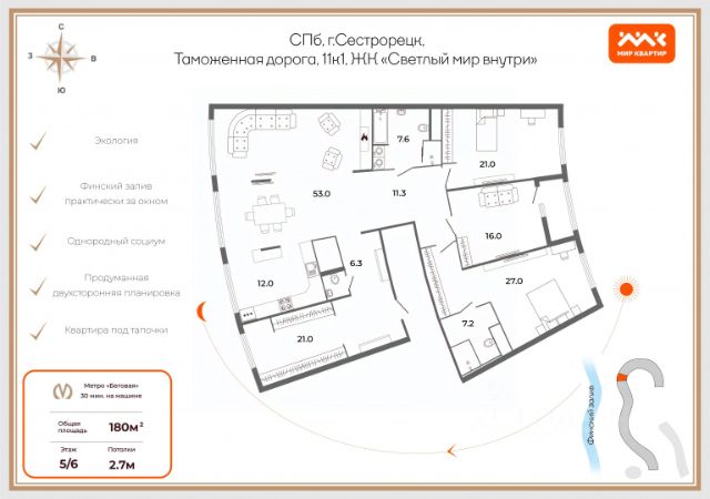 Лисино "Лисино" город-парк в Курортном районе Санкт-Петербурга от компании "Унистрой". Рядом Финский залив, экопарк, озеро, а также самый высокий небоскреб в Европе. Комплекс отличает чистый воздух, малоэтажная застройка, фасады из клинкерной плитки, уютные дворы, прогулочный бульвар, парковые зоны. Представлено разнообразие планировок: от студий, до двухуровневых квартир. Живите там, где другие отдыхают Город-парк "Лисино" находится в Курортном районе Санкт-Петербурга, в 15 минутах езды по Приморскому шоссе от станции метро "Беговая". Рядом Финский залив с благоустроенным пляжем, экопарк, озеро Сестрорецкий разлив и "Лахта Центр". Локация славится морским воздухом и хвойными лесами. Вблизи расположены Сестрорецкие болота, известные минеральной водой и лечебными грязями. Живите там, где комфортная застройка Комплекс состоит из малоэтажных домов квартальной застройки, создающих приватные дворы без машин. Высота в 4 этажа обеспечивает уют и простор. Урбан-виллы с террасами отделены приватными садами и прогулочными зонами. Фасады из клинкерной плитки натуральных оттенков подчеркивают природное окружение. Дома расположены таким образом, чтобы из квартир открывались виды на лесопарк или сад. Живите там, где много парков Территория выполнена в виде сенсорных садов, отражающих времена года с соответствующей растительностью. В центре расположен парк с различными зонами: центральная площадь, пруд с набережной, игровые площадки для детей, йога-парки, экотропа, спортивный хаб, скейтпарк, памптрек, велодорожки. Живите там, где стильно Двор и входы в парадные без пандусов и ступеней. Входные группы и холлы оформлены в натуральных оттенках по авторскому дизайн-проекту, и включают домофоны в тёплых тамбурах, бесшумные лифты и колясочные. Жилые этажи выдержаны в едином стиле. На цокольных этажах есть индивидуальные кладовые. Живите там, где красивые виды В "Лисино" представлены разнообразные планировочные решения: студии, евроформаты, квартиры с саунами, мастер-спальнями, угловыми окнами, постирочными. На первых этажах расположены квартиры с террасами. Доступны двухуровневые квартиры и урбан-виллы, а также квартиры с тёплыми лоджиями. Живите там, где высокий сервис В квартирах предусмотрена предчистовая отделка с качественными материалами: металлические входные двери со smart-замками, улучшенная теплоизоляция, окна с энергоэффективными стеклопакетами, стяжка пола, скрытая разводка коммуникаций, радиаторы с терморегуляцией. Входы в парадные оснащены домофонами с бесконтактным доступом и распознаванием лиц. Питьевая вода будет подаваться в каждую квартиру. Автоматизирован учет потребления ресурсов. Живите там, где всё рядом В "Лисино" будут 2 школы и 4 детских сада, а также поликлиника, многофункциональный центр, физкультурно-оздоровительный комплекс и культурный центр. На первых этажах откроются коммерческие помещения. Комплекс будет оснащен многоуровневым паркингом, автостоянкой, станциями для заряда электромобилей, велопарковками и местами для выгула живот Продается 3-комнатная квартира с евроремонтом в районе Курортный в Санкт-Петербурге.