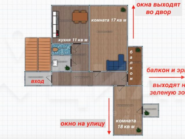 Окна выходят на улицу и во двор. Очень удачная планировка и большой метраж!