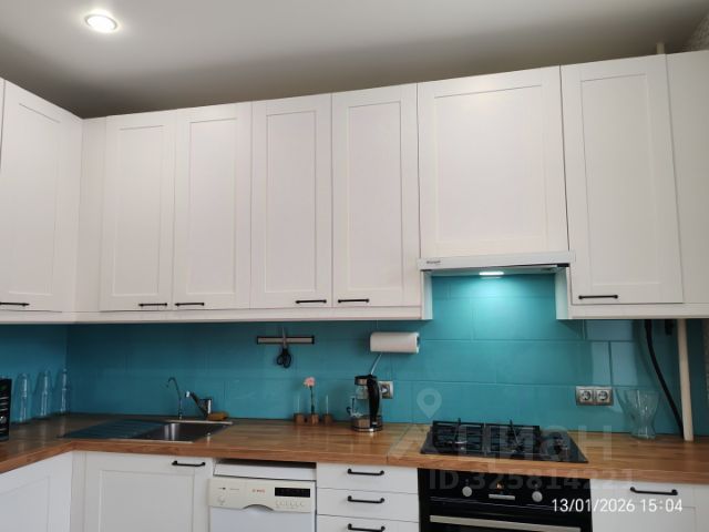 Кухня 17 кв.м, в которой имеется вся необходимая встроенная бытовая техника (посудомоечная машина, духовой шкаф, холодильник). Все столешницы изготовлены из искусственного камня. Сделан теплый пол. Из кухни вход на застекленную лоджию площадью 4,2 кв.м, где обустроена зона отдыха, но может быть использована и в качестве рабочего уголка.