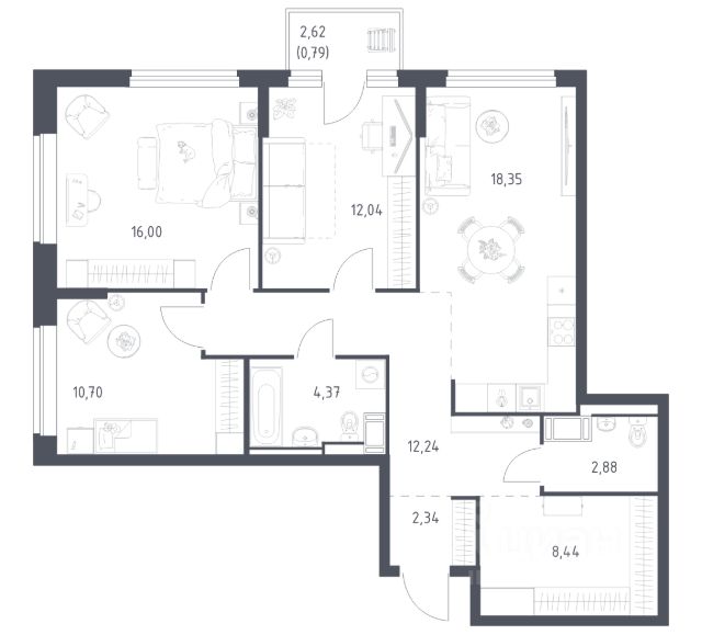В продаже 3-комнатная квартира в корпусе 35.1 ЖК 'Новое Колпино'. Квартира располагается на 10 этаже, общая площадь 87.37 м2.
