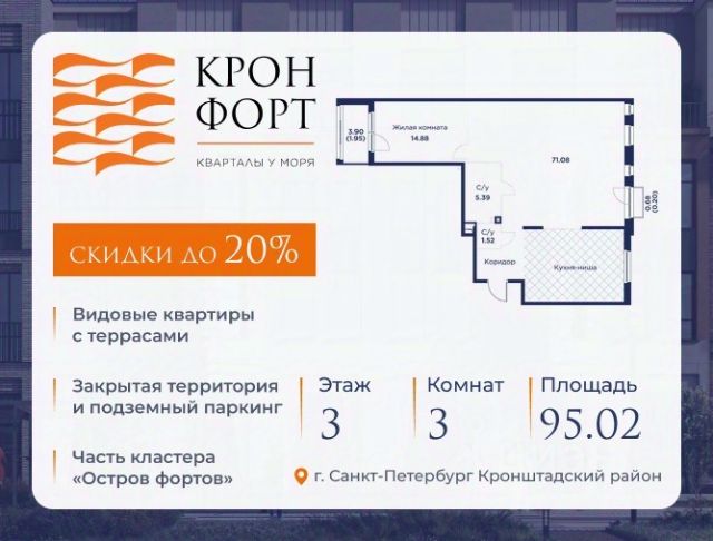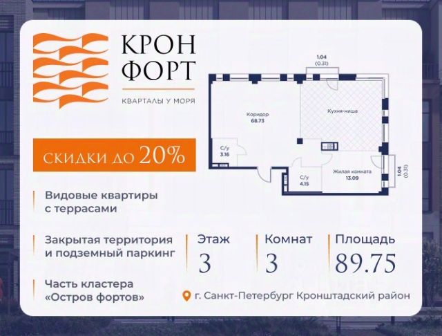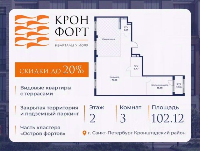 Стоимость квартиры указана со скидкой 20%. Скидка предоставляется при 100% оплате или несубсидированной ипотеке. Предлагается квартира площадью 79.41 кв.м в жилом комплексе "Кронфорт. Центральный" в Санкт-Петербурге (Кронштадт). Возможна покупка с использованием льготных и специальных ипотечных программ с государственной поддержкой. Высота потолков в квартирах — от 3 до 3,4 метров, окна увеличенного размера, есть варианты с эркерами, французскими балконами, лоджиями и террасами. Жилой квартал состоит из пяти четырехэтажных корпусов с закрытыми охраняемыми дворами, свободными от машин. Первые этажи формируют торговые променады в стиле пешеходных улиц исторической части Петербурга и Кронштадта. Внутренние пространства между корпусами — пешеходные зоны с уютными площадями. Архитектурный облик квартала разработан бюро "Проектная культура" и международной компанией Chapman Taylor. Инфраструктура комплекса включает: - Лицей с двумя бассейнами - Детский сад на 150 мест с бассейном и закрытой территорией - Веревочный парк - Игровые площадки для активного отдыха; - Кабинет врача общей практики. - Подземные паркинги с лифтами. - Мусоросборные камеры, индивидуальные кладовые. - Закрытые дворы с контролем доступа и видеонаблюдением. - Мультформатный стрит-ретейл с кафе и ресторанами. - Триатлон-центр и беговые/велодорожки. - Учебно-тренировочный комплекс для детей "Лагерь настоящих героев". Транспортная доступность обеспечивает удобный выезд на КАД (около 1-3 км), 2 минуты пешком до автобусной остановки "Лицей", 25 минут до Сестрорецка, 30 минут до "Лахта-центра", 50 минут до аэропорта "Пулково" и 60 минут до Московского вокзала. Для любителей моря доступен маршрут на "Метеоре" до центра Санкт-Петербурга. Отделка квартир предлагается как с готовой чистовой отделкой, так и со свободной планировкой без отделки для реализации индивидуальных дизайнерских решений. В третьем корпусе, продажи которого стартовали в марте 2025 года, доступны квартиры с просторными террасами, тремя балконами, кухнями-гостиными до 38 кв.м с окнами на две стороны, обеспечивающими панорамное освещение и виды. Если вам нужна помощь с оформлением ипотеки или дополнительная информация по комплексу и условиям покупки, обращайтесь в отдел продаж за консультацией. Продам 3-комнатную квартиру в микрорайоне Кронштадт в Санкт-Петербурге.