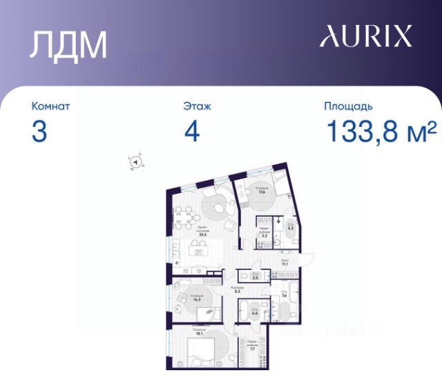 Продается 3-к квартира без отделки в ЖК "ЛДМ". Общая площадь квартиры — 133.8 кв. м, этаж 4 из 8. Тип дома — монолитный. Цена указана при 100% оплате.