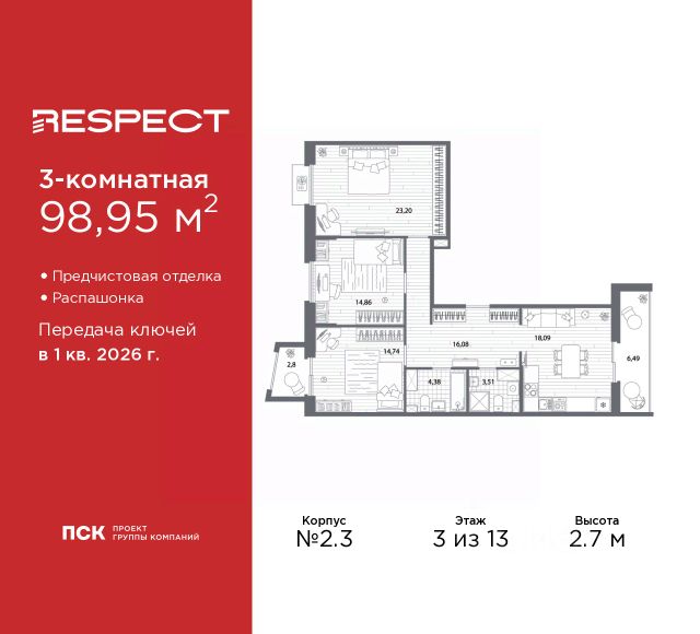 Трехкомнатная квартира с предчистовой отделкой в ЖК "RESPECT" на 2 этаже. Общая площадь: 80.92 кв.м., жилая: 44.24 кв.м., площадь просторной кухни-столовой: 16.53 кв.м. Угловая квартира, окна oбecпeчивaют paвнoмepнoe ocвeщeниe в тeчeниe дня. В квартире один балкон и две лоджии, один совмещенный и один раздельный санузел. Высота потолков 2.7 м. Квартира будет сдана с отделкой WHITE BOX, в которую включены следующие виды работ: - заливка стяжки; - установлена система отопления квартиры; - подготовлены потолки; - все стены выровнены, загрунтованы и отштукатурены; - электрическая проводка разведена по комнатам. Квартира будет готова к чистовой отделке. Квартира находится в корпусе 6. Дом монолитный, одноподъездный, высотой 13 этажей. На этаже 8 квартир. В подъезде 1 пассажирский и 1 грузовой лифт. Окончание строительства - 4 квартал 2026 года. Оформление сделки по договору долевого участия. В шаговой доступности от жилого комплекса расположены станции метро (расстояние по прямой): "Лесная" (800 м), "Площадь Мужества" (1.4 км), "Выборгская" (1.9 км), также недалеко от этого корпуса находятся станции метро: "Академическая", "Политехническая". Жилой квартал "RESPECT" строится на Полюстровском пр, 87, в одной из самых востребованных локаций Петербурга. В 10 минутах пешком - метро "Лесная" и в 10 минутах на транспорте - Петроградская сторона. Высота домов от 7 до 13 этажей. Квартиры сдаются с отделкой white box и с чистовой отделкой. На территории Respect строится школа на 1125 учащихся и детский сад на 240 мест. Запроектированы собственная газовая котельная, закрытая территория, дворы без машин и подземные паркинги с лифтами. В проекте предусмотрены трапециевидные балконы или остекленные лоджии, которые, с одной стороны, исключают монотонность фасада, являясь декоративными элементами, с другой дополнительным функциональным пространством в квартирах. Цветовая гармония фасадов каждого дома раскрывает характер квартала. Коричневый цвет клинкерного кирпича со структурой водяных штрихов — цвет уюта и безопасности, сдержанности и надёжности. Вентилируемые фасады облицованы клинкерным кирпичом. Его высокая прочность позволяет давать 100 лет гарантии на этот материал. Водопоглощение клинкерного кирпича составляет менее 5%, за счет чего у него высокая теплопроводность и прочность. В квартале запроектированы внутренние закрытые территории дворов домов без доступа автомобилей и безбарьерная среда для велосипедистов и колясок. Предусмотрены IP-домофония с функцией дистанционного открывания калиток и парадных, а также дистанционный сбор показаний счетчиков и мобильное приложение для жителей. Для безопасности жителей квартала - круглосуточное видеонаблюдение и служба охраны. В каждой квартире предусмотрены внешние корзины для кондиционеров. Вся территория квартала будет связана единой концепцией благоустройства, разработанной ландшафтным бюро L.BURO. На эксплуатируемой кровле на уровне первого этажа в домах 1 и 4 будут обустроены общественные ви