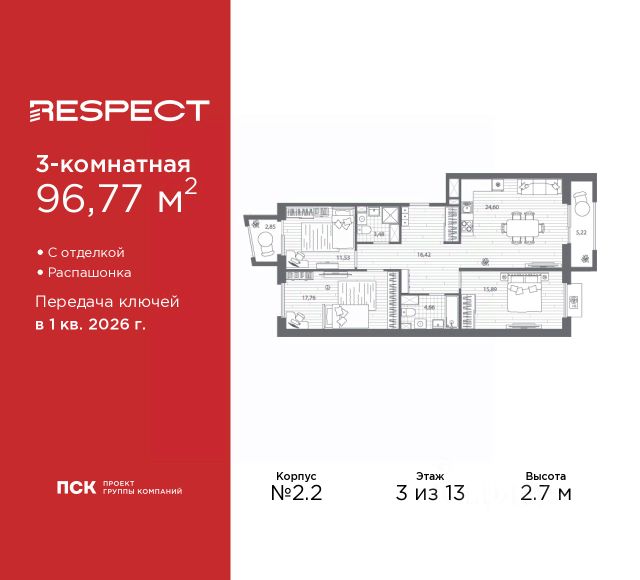 Просторная 3-комн. квартира с предчистовой отделкой в ЖК "RESPECT" на 9 этаже. Общая площадь: 79.72 кв.м., жилая: 44.24 кв.м., площадь просторной кухни-столовой: 16.03 кв.м. Квартира угловая, идеально подойдет любителям тишины и панорамных видов. В квартире один балкон и две лоджии, один совмещенный и один раздельный санузел. Высота потолков 2.7 м. Квартира будет сдана с отделкой WHITE BOX, в которую включены следующие виды работ: - заливка стяжки; - установлена система отопления квартиры; - подготовлены потолки; - все стены выровнены, загрунтованы и отштукатурены; - электрическая проводка разведена по комнатам. Квартира будет готова к чистовой отделке. Квартира находится в корпусе 6. Дом монолитный, одноподъездный, высотой 13 этажей. На этаже 8 квартир. В подъезде 1 пассажирский и 1 грузовой лифт. Окончание строительства - 4 квартал 2026 года. Оформление сделки по договору долевого участия. В шаговой доступности от жилого комплекса расположены станции метро (расстояние по прямой): "Лесная" (800 м), "Площадь Мужества" (1.4 км), "Выборгская" (1.9 км), также недалеко от этого корпуса находятся станции метро: "Академическая", "Политехническая". Квартал строится на Полюстровском пр, 87, в одной из самых востребованных локаций Петербурга. В 10 минутах пешком - метро "Лесная" и в 10 минутах на транспорте - Петроградская сторона. Высота домов от 7 до 13 этажей. На территории Respect строится школа на 1125 учащихся и детский сад на 240 мест. Запроектированы собственная газовая котельная, закрытая территория, дворы без машин и подземные паркинги с лифтами. Вентилируемые фасады облицованы клинкерным кирпичом. Дома из этого материала служат веками, являясь гордостью хозяев. Дизайн парадных зон и входных групп - сочетание лаконичности отделки и декоративных элементов с текстурами из натурального камня и дерева с приглушенной подсветкой теплым светом. Во входных группах расположены гостевые зоны с мягкой мебелью. Вся территория квартала будет связана единой концепцией благоустройства, разработанной ландшафтным бюро L.BURO. В основе - идея создания увлекательного ландшафтного пространства для насыщенной жизни, включающего в себя пейзажные зоны, современные архитектурные композиции, открытые террасы на стилобатах с зонами отдыха и парклетами, спортивными площадками. Это пространство для людей всех возрастов и различных увлечений. На эксплуатируемой кровле на уровне первого этажа в домах 1 и 4 будут обустроены общественные видовые террасы. В квартале запроектированы внутренние закрытые территории дворов домов без доступа автомобилей и безбарьерная среда для велосипедистов и колясок. Предусмотрены IP-домофония с функцией дистанционного открывания калиток и парадных, а также дистанционный сбор показаний счетчиков и мобильное приложение для жителей. Для безопасности жителей квартала - круглосуточное видеонаблюдение и служба охраны. В каждой квартире предусмотрены внешние корзины для кондиционеров. #zM2T8z Купить 3-комнатную квартиру рядом с метро Площадь Мужества.
